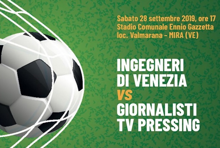 Il Presidente dell’Ordine di Venezia ing. Mariano Carraro ha il piacere di invitarvi alla partita di calcio amichevole tra gli Ingegneri Veneziani (coordinati dal nostro iscritto ing. Giuseppe Baldo) e i Giornalisti TV Pressing.