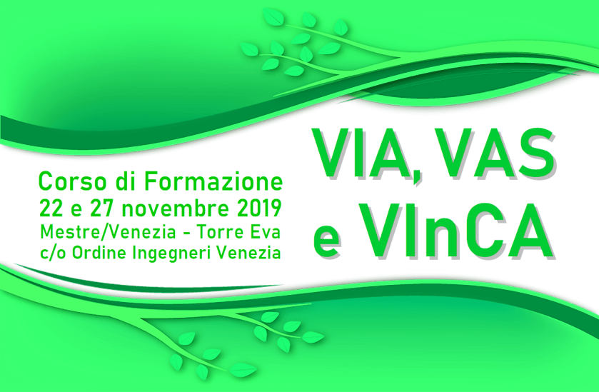 In tale contesto, l’Ordine Ingegneri Venezia, la Fondazione Ingegneri Veneziani e il Collegio Ingegneri Venezia con l’Ordine degli Architetti Pianificatori, Paesaggisti e Conservatori della Provincia di Venezia, la Fondazione Architetti Pianificatori Paesaggisti e Conservatori della Provincia di Venezia, l’Ordine Provinciale dei Chimici e dei Fisici di Venezia e l’Ordine dei Geologi Regione del Veneto, co-organizzano il corso “Le procedure di valutazione ambientale per i piani ed i progetti: VIA, VAS e VInCA” che si terrà nelle giornate del 22 e 27 novembre 2019, dalle ore 15,00 alle ore 19,00 – presso l’Ordine Ingegneri Venezia in Via Bruno Maderna, 7 – Mestre Venezia, per un totale di 8 ore.