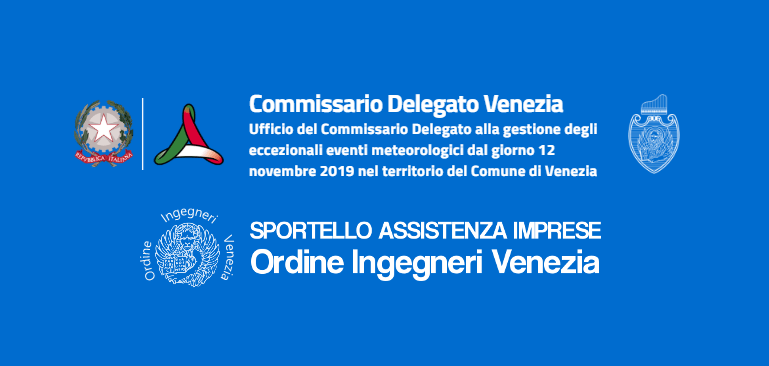 L’Ordine Ingegneri Venezia offre supporto per la compilazione dei moduli telematici per la ricognizione dei danni subiti e la domanda di contributo. Le procedure si effettuano esclusivamente online attraverso il sito www.commissariodelegato.venezia.it.