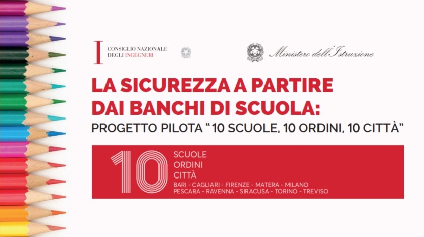 “La sicurezza a partire dai banchi di scuola: 10 Scuole, 10 Ordini, 10 Città” è un progetto pilota elaborato dal Gruppo di lavoro Sicurezza del CNI. L’obiettivo primario punta alla diffusione della cultura della sicurezza e della salute nei luoghi di lavoro.