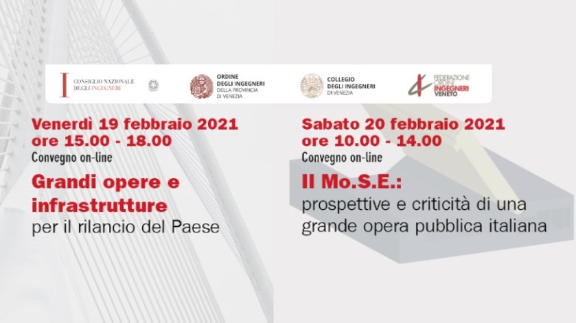 Due giornate in videoconferenza organizzate dal Consiglio Nazionale Ingegneri, Ordine Ingegneri Venezia, Collegio Ingegneri Venezia e Federazione Ordini Ingegneri Veneto. L’appuntamento è in programma per venerdì 19 febbraio dalle ore 15 alle 18 (prima sessione) e sabato 20 febbraio dalle ore 10 alle 14 (seconda sessione).