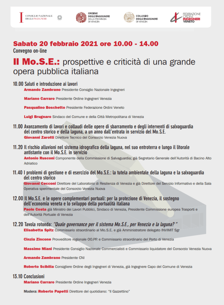 Il Convegno “Il MoSE: prospettive e criticità di una grande opera pubblica” è in programma sabato 20 febbraio dalle ore 10 alle 14. L’evento, moderato dal giornalista Roberto Papetti, si articola in una parte iniziale di interventi istituzionali, a seguire quelli tecnici e poi un dibattito conclusivo al quale parteciperanno tecnici, amministratori e commissari responsabili del progetto e dei lavori del sistema MoSE, incluse le opere di salvaguardia della laguna. Nell’occasione verrà fatto il punto aggiornato sullo stato di avanzamento dei lavori.