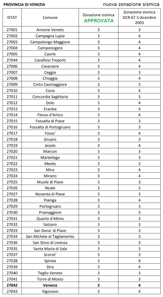 “Abbiamo seguito e continueremo a seguire con grande attenzione questa importante tematica – ha commentato l’ing. Mariano Carraro Presidente dell’Ordine Ingegneri Venezia – ora la zonazione è definitiva, si tratta di un traguardo fondamentale che deve essere conosciuto dagli ingegneri operanti nel nostro territorio poiché tutti i 44 territori comunali veneziani sono passati in zona 3”.