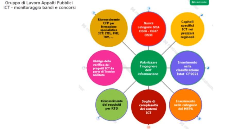 Il compito di questo gruppo è quello di sponsorizzare ed analizzare diversi argomenti tutti atti a dare maggiore attenzione alla categoria dell’Ingegneria dell’Informazione, a tal proposito grazie all’intervento del presidente Zambrano, è stato accolto dall’ISTAT la richiesta di inserire l’ingegneria dell’informazioni nelle classificazioni professionali (modifica fatta di solito ogni 10 anni), altro problema è che nel MEPA non esiste una categoria merceologica dell’ingegneria dell’informazione anche su questo dopo confronto con CNI è stato aperto uno spiraglio.