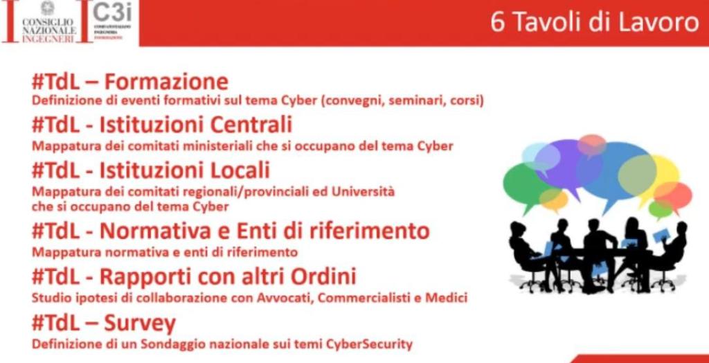 a seguire in quanto responsabile del Gdl Cyber Security Annunziata ha segnalato che c’è l’intenzione di coinvolgere il territorio con un sondaggio per capire quanto gli iscritti ne sanno di Cyber Securirty, per quanto riguarda invece le attività svolte in questi mesi sono stati prodotti alcuni eventi a livello nazionale: