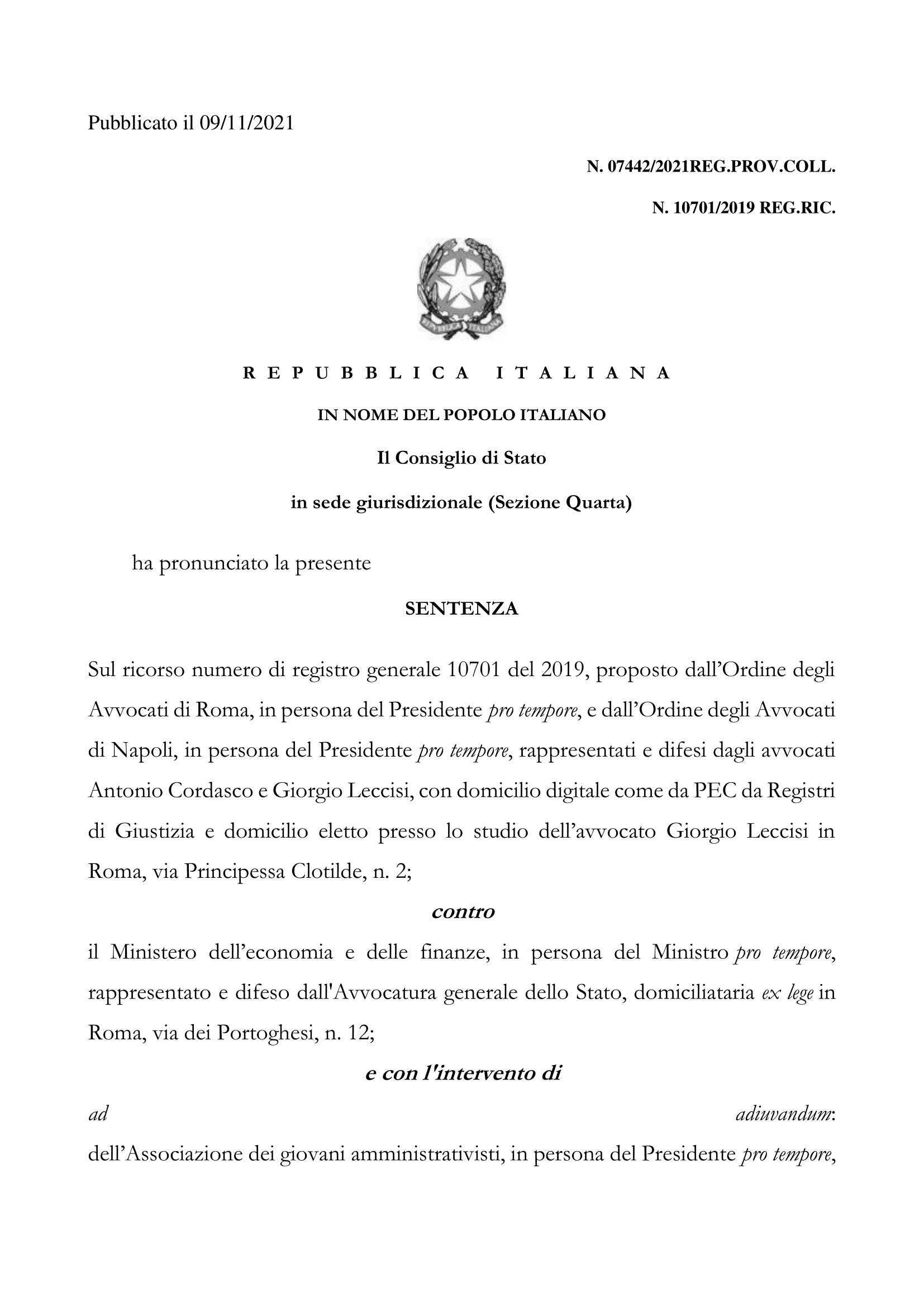 Le 25 pagine della sentenza del Consiglio di Stato del 9 novembre 2021, n. 7442