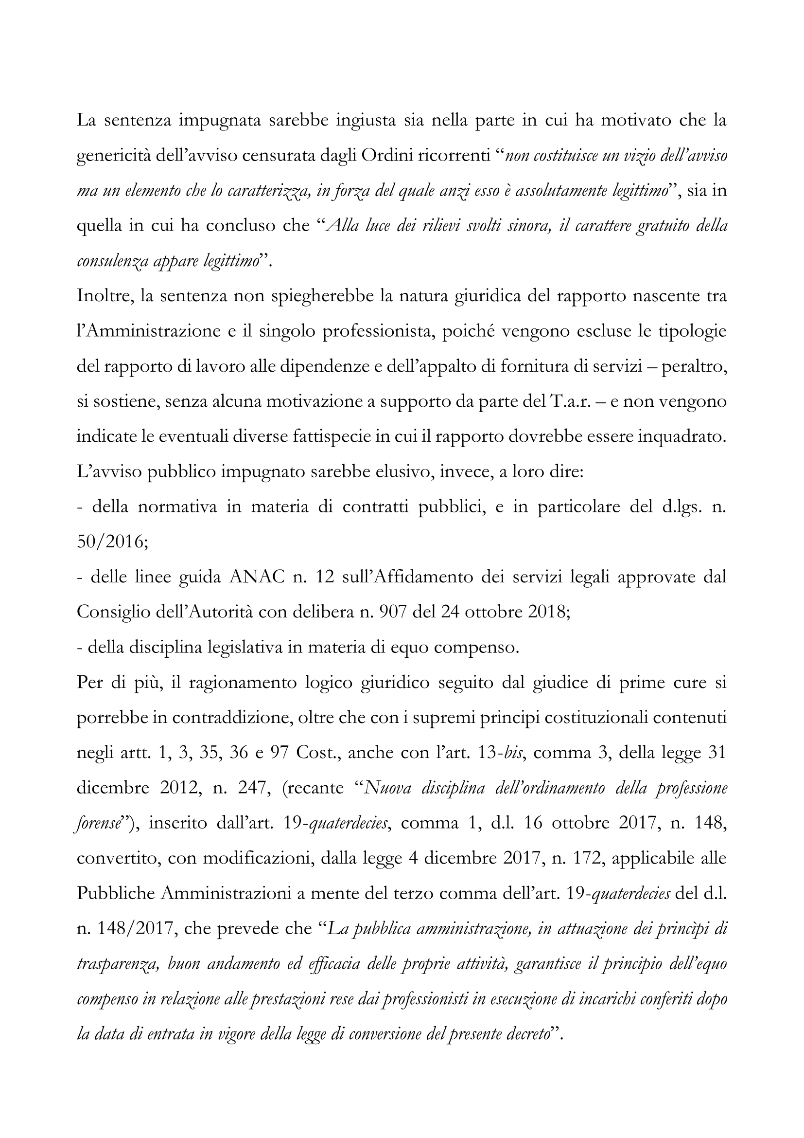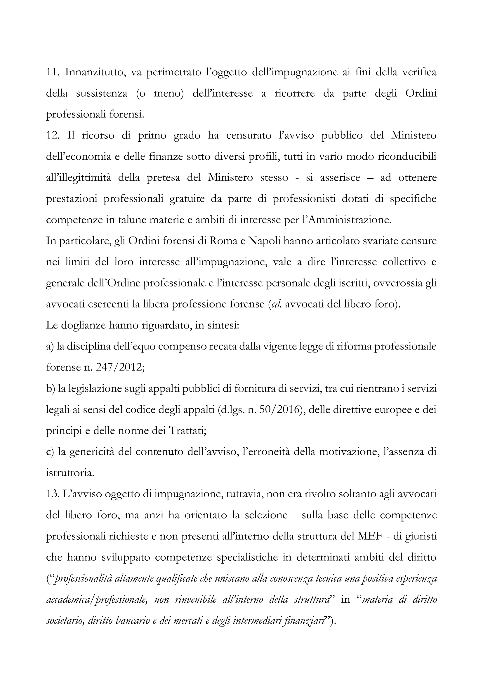 La sentenza è stata pronunciata a seguito del ricorso di alcuni Ordini Provinciali di Avvocati contro un avviso pubblico di manifestazione di interesse proposto da un Ministero per il conferimento di incarichi di consulenza a titolo gratuito, di “professionalità altamente qualificate, che uniscano alla conoscenza tecnica una positiva esperienza accademica/professionale, non rinvenibile all’interno della struttura, al fine di avere supporto ad elevato contenuto specialistico nelle materie di competenza”.