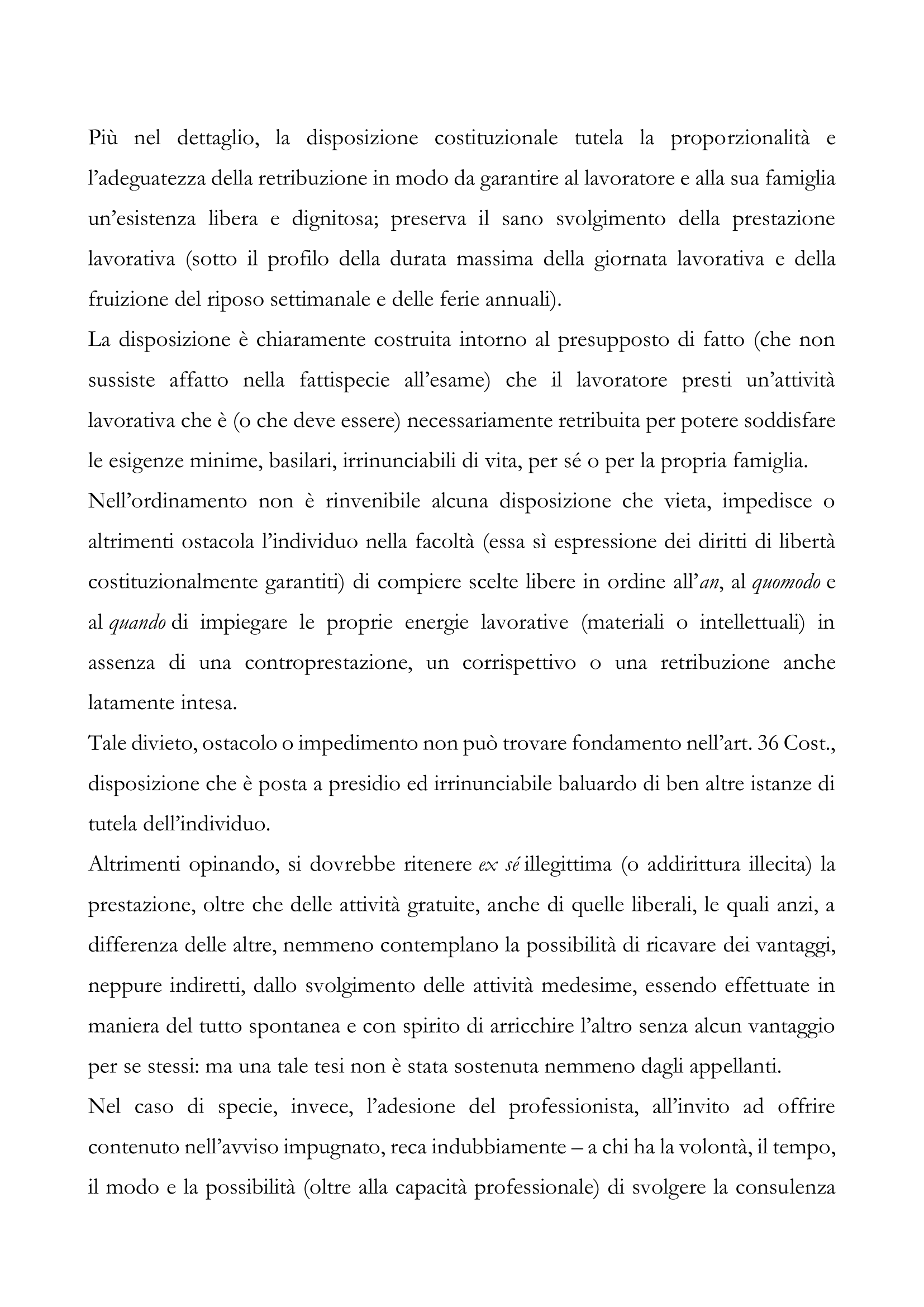 Nessun riferimento quindi alla gratuità dell’incarico, considerata in questo caso legittima perché riguardante una prestazione discrezionale e senza alcun corrispettivo riferibile alla tutela dell’equo compenso.