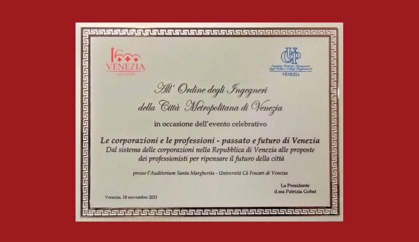 La Presidente del CUP Patrizia Gobat ha consegnato una targa commemorativa all’Ordine Ingegneri Città Metropolitana di Venezia, ritirata dal Presidente Mariano Carraro con il Vice Presidente Mario de Marchis, in onore delle celebrazioni per i 1600 anni dalla nascita di Venezia.