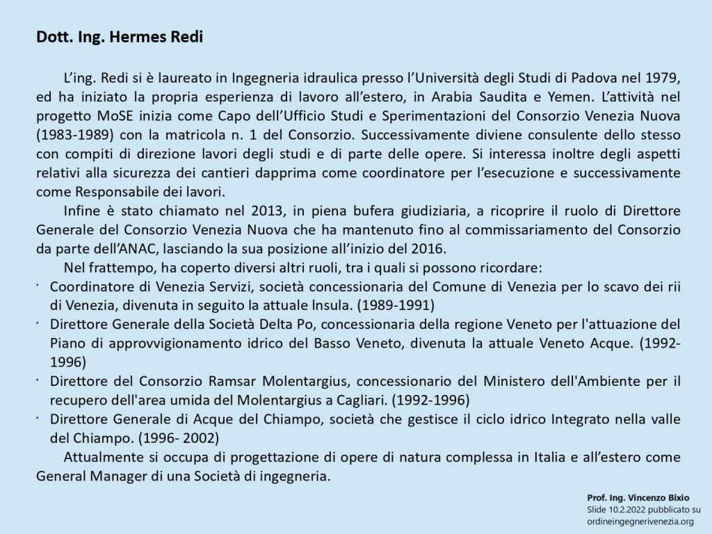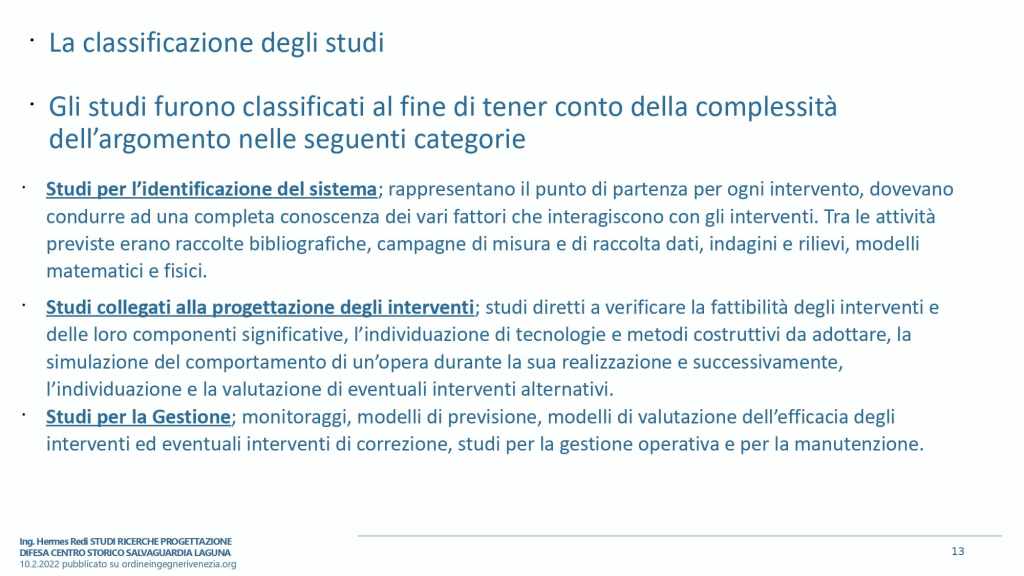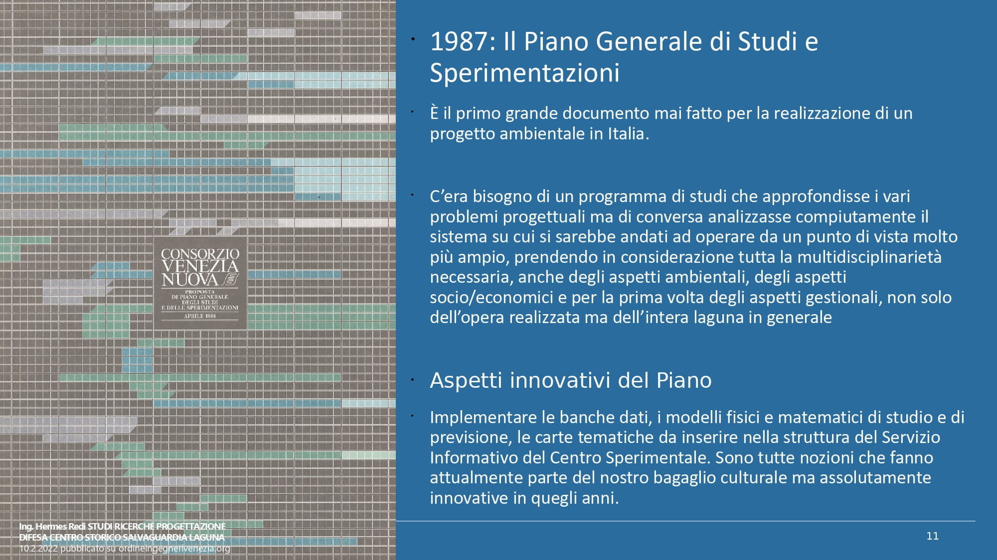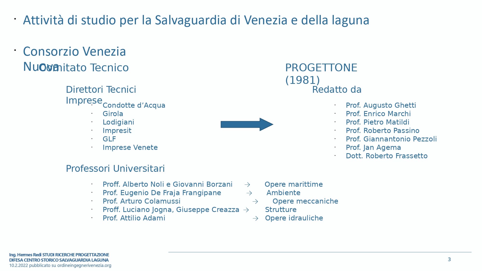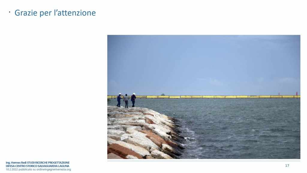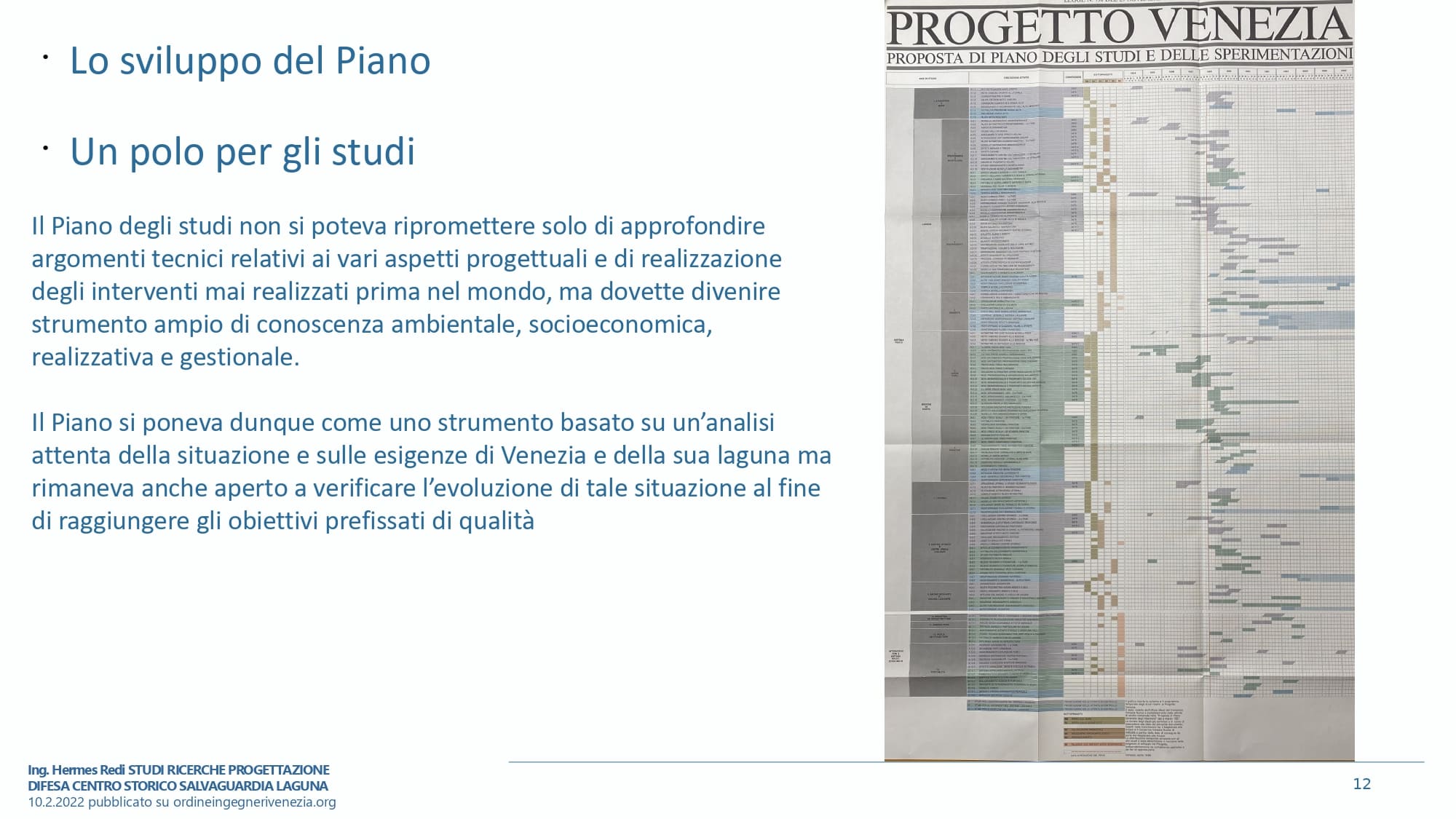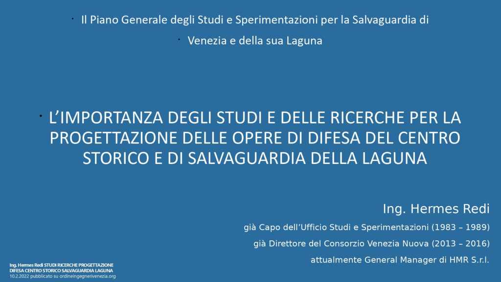 Relazione dell’Ing. Hermes Redi tenuta a Venezia il 10 febbraio 2022, video e slide sul Piano Generale degli Studi per la Salvaguardia di Venezia e la sua Laguna centrata sull’importanza degli studi e delle ricerche per la progettazione delle opere di difesa.