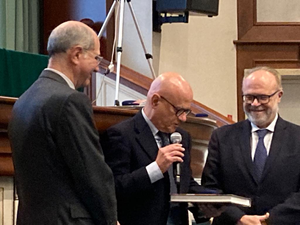 Mariano Carraro ha affiancato il Presidente del Collegio, Sandro Boato, nella consegna delle oselle e anche del libro dedicato all’opera dell’ingegner Ferdinando Forlati, un protagonista del restauro nelle Venezie del novecento.