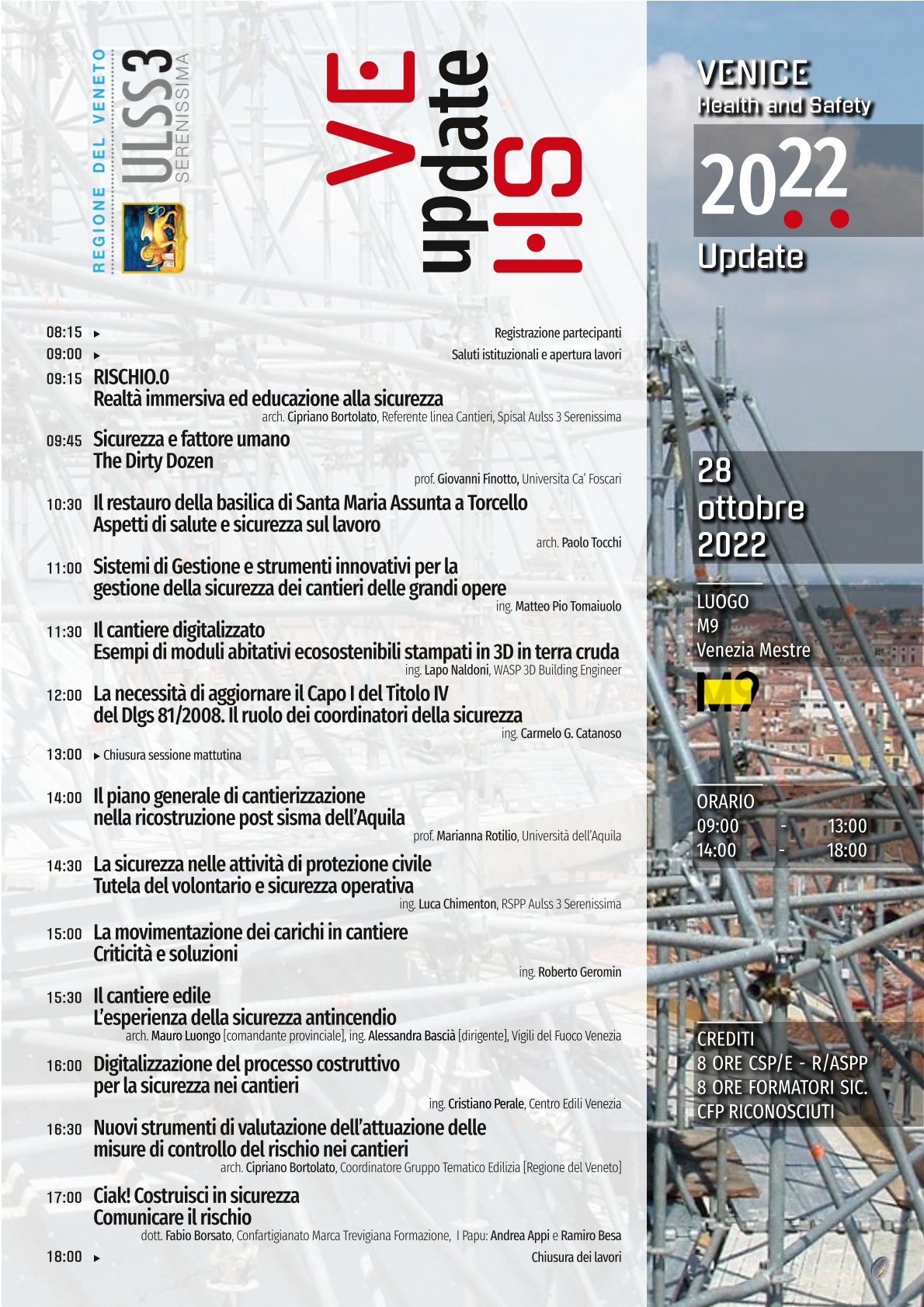 L’Ordine degli Ingegneri della Città Metropolitana di Venezia e la Fondazione Ingegneri Veneziani co-organizzano con l’Azienda Ulss n. 3 Serenissima, assieme ai partner nel Comitato Tecnico Scientifico Interprofessionale Salute e Sicurezza Venezia, il seminario gratuito “Venice Health and Safety Update 2022”.