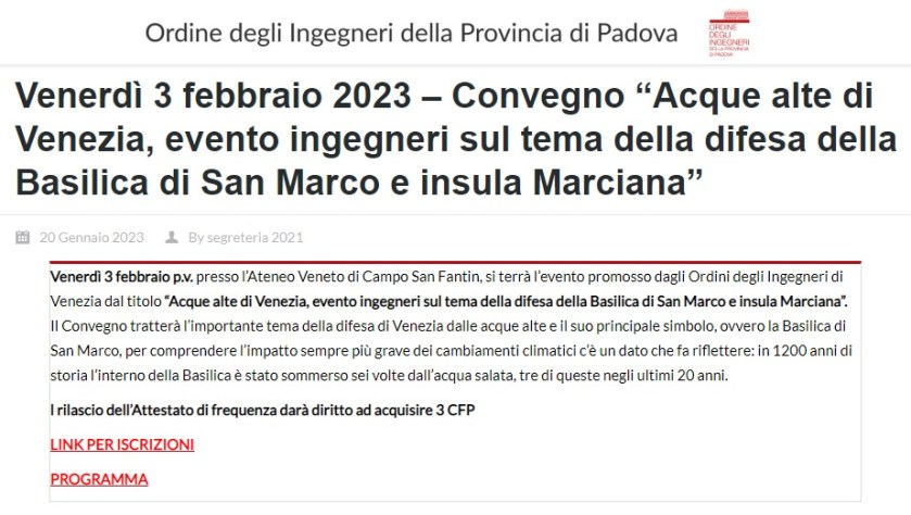 Questo reportage contiene i materiali (slide, video, immagini e rassegna stampa) del convegno “La difesa dalle acque alte della Basilica di San Marco e dell’Insula Marciana” organizzato il 3 febbraio 2023 dall’Ordine Ingegneri Venezia con il Collegio Ingegneri Venezia, la collaborazione e il patrocinio dell’Ateneo Veneto.