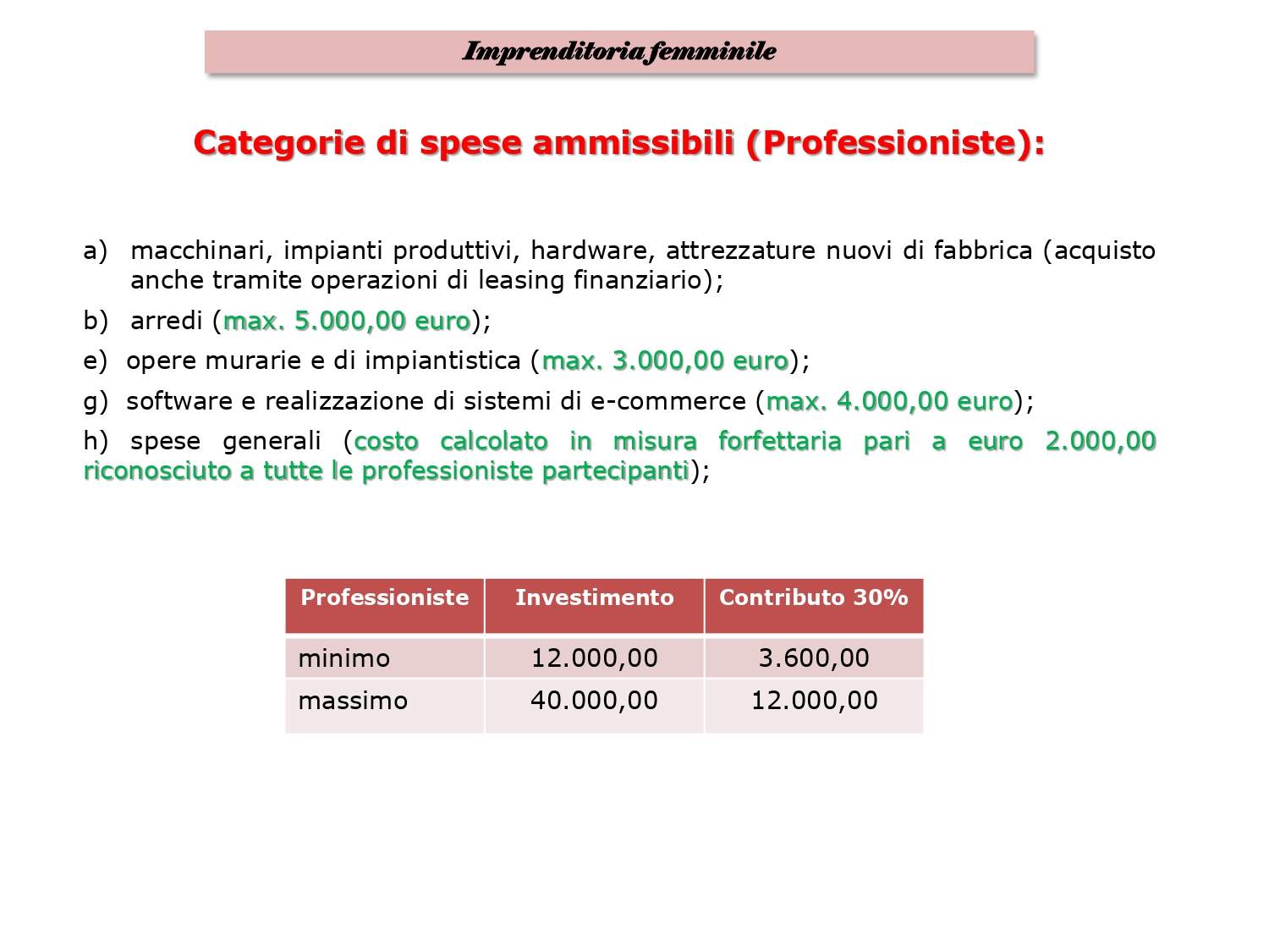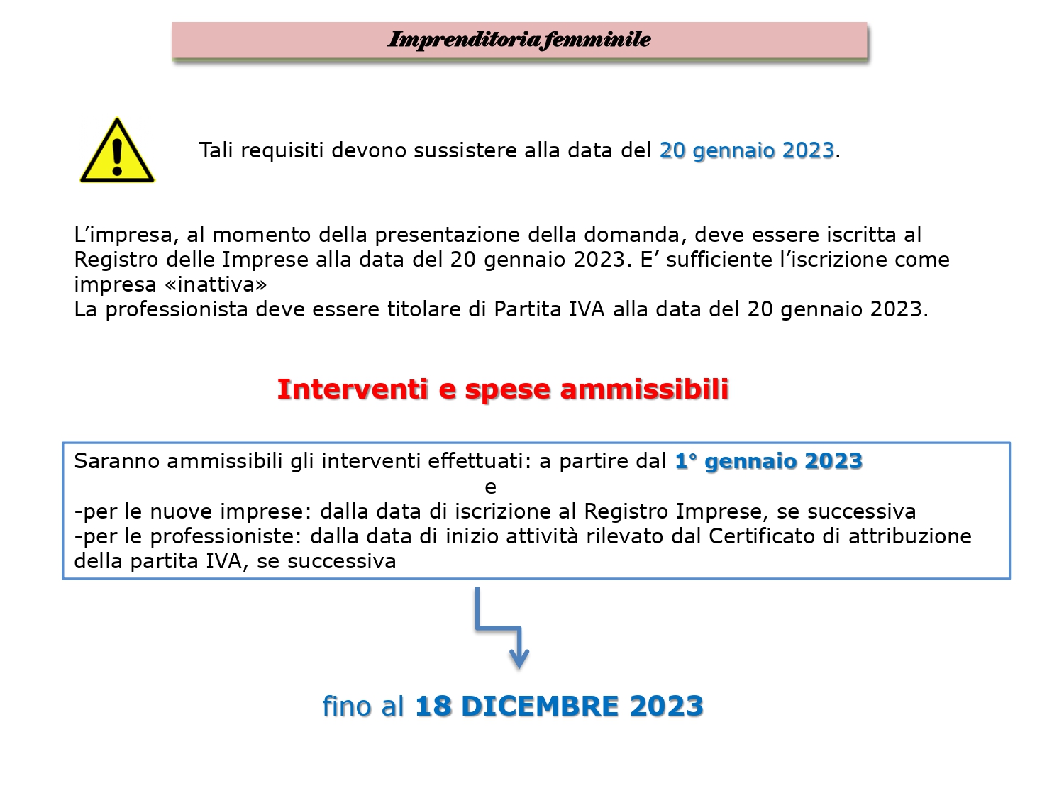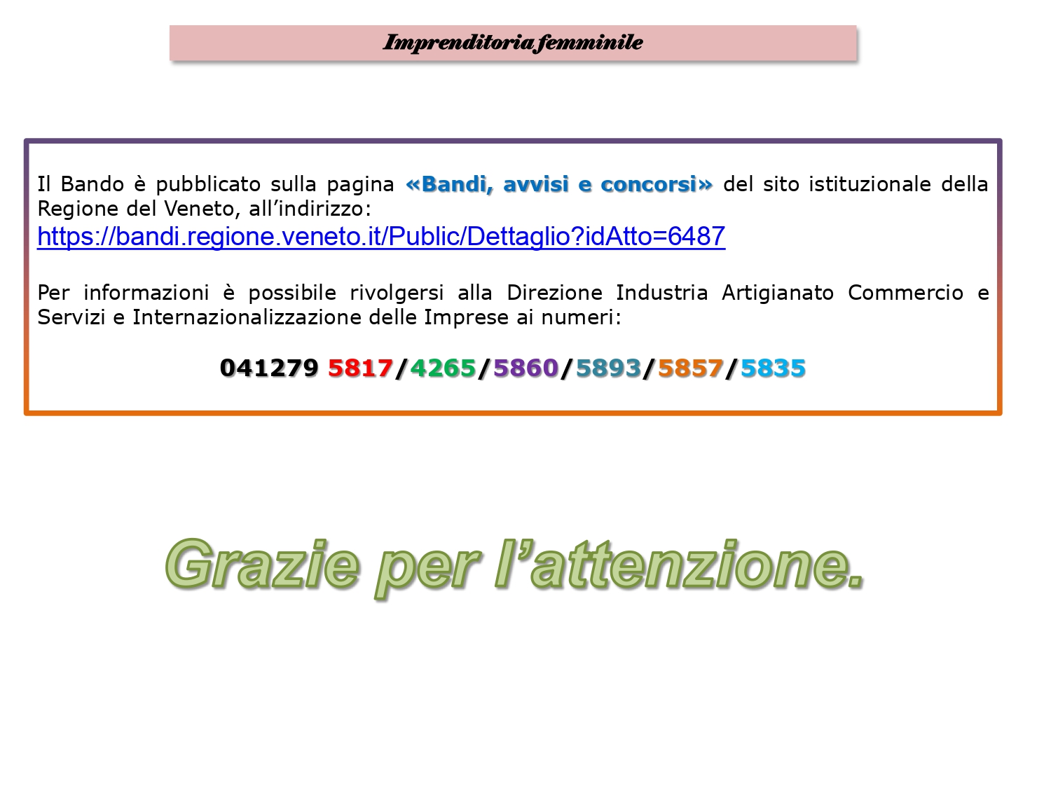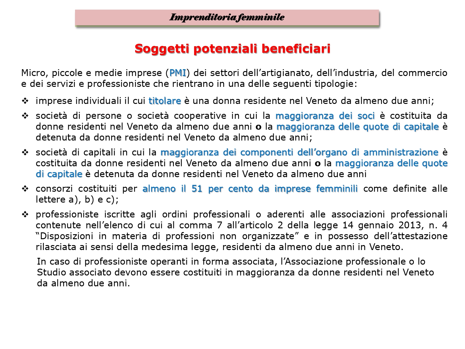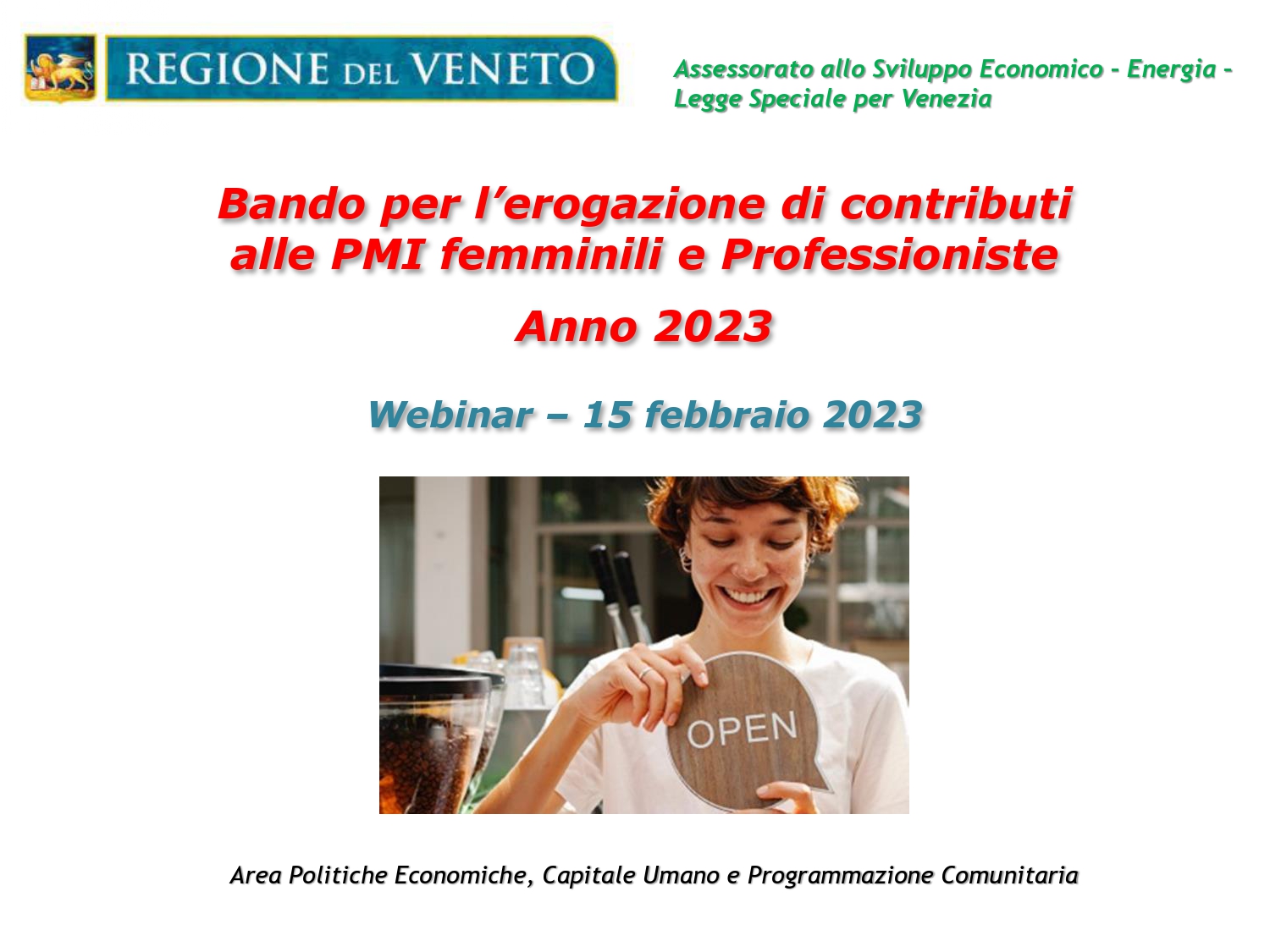 Il Bando (clicca qui per vedere le slide illustrative) è volto a promuovere e sostenere le piccole e medie imprese (PMI) a prevalente partecipazione femminile nei settori dell’artigianato, dell’industria, del commercio e dei servizi nonché le attività professionali esercitate da donne, operanti in forma singola, associata o societaria, al fine di rafforzare e arricchire il tessuto imprenditoriale veneto ai sensi dell’articolo 1 comma 1 lettera a) della legge regionale 20 gennaio 2000 n 1 «Interventi per la promozione di nuove imprese e di innovazione dell’imprenditoria femminile», come modificata dall’art 8 della legge regionale 25 giugno 2021 n 17.