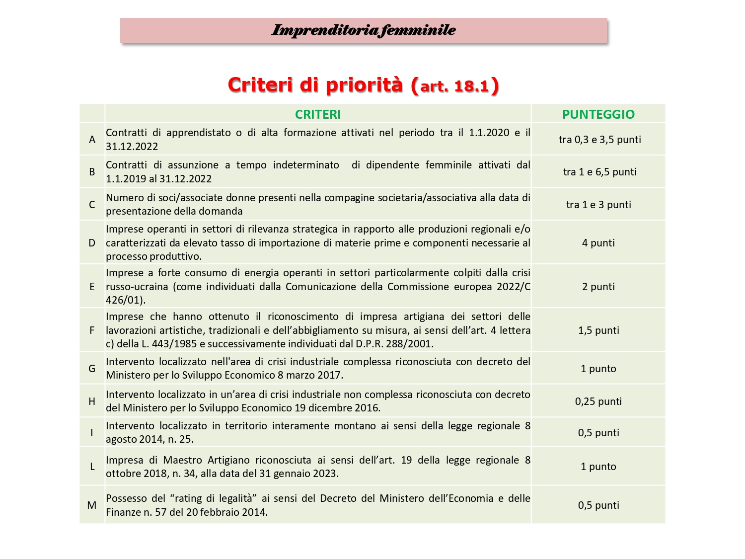 La Giunta regionale, con delibera n. 115 del 6 febbraio 2023, ha approvato il Bando per l’erogazione di contributi alle PMI a prevalente partecipazione femminile e alle professioniste per l’anno 2023.