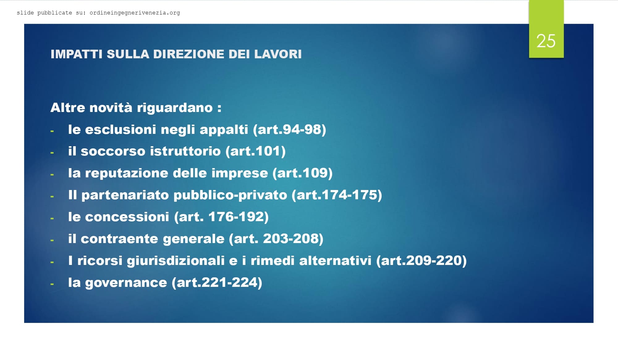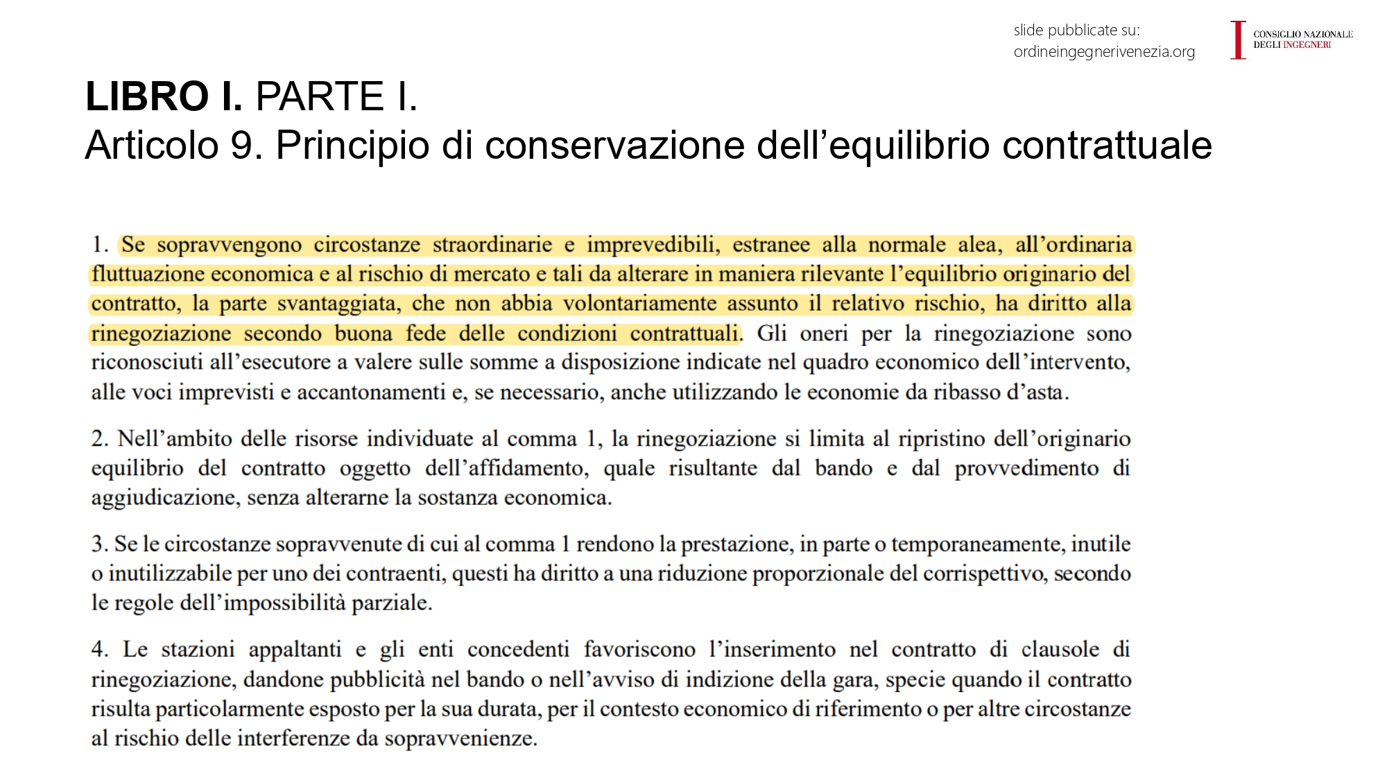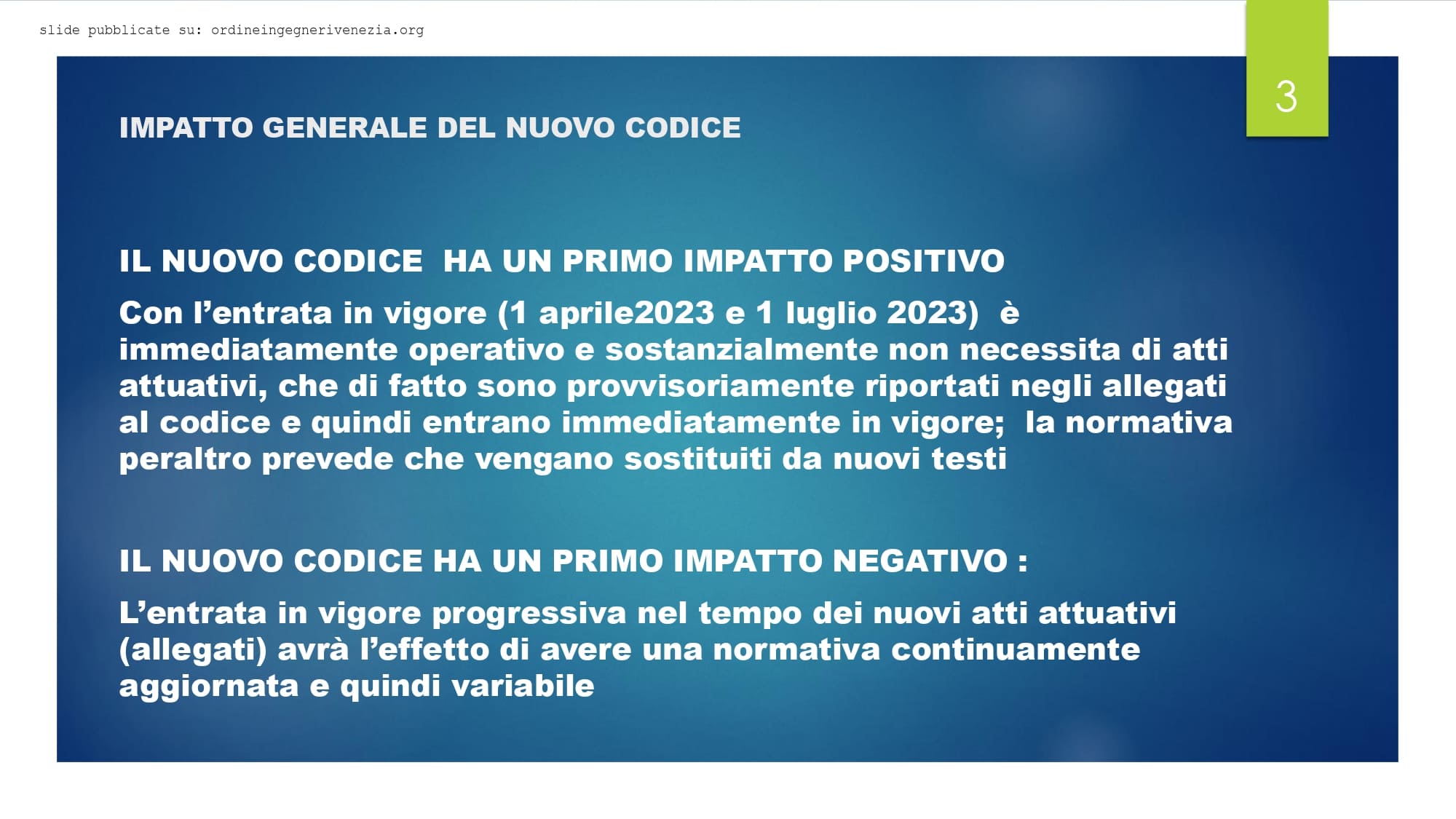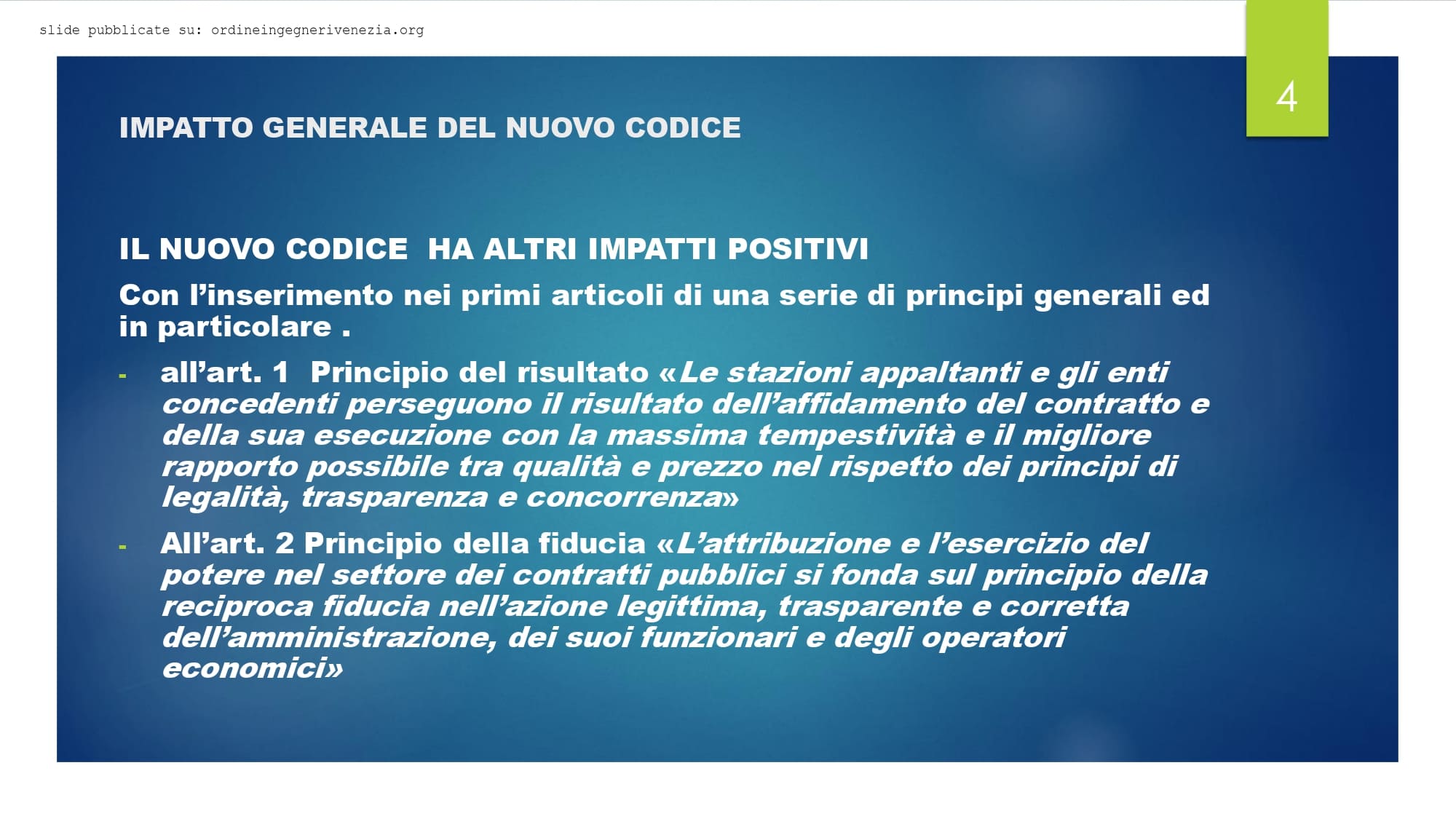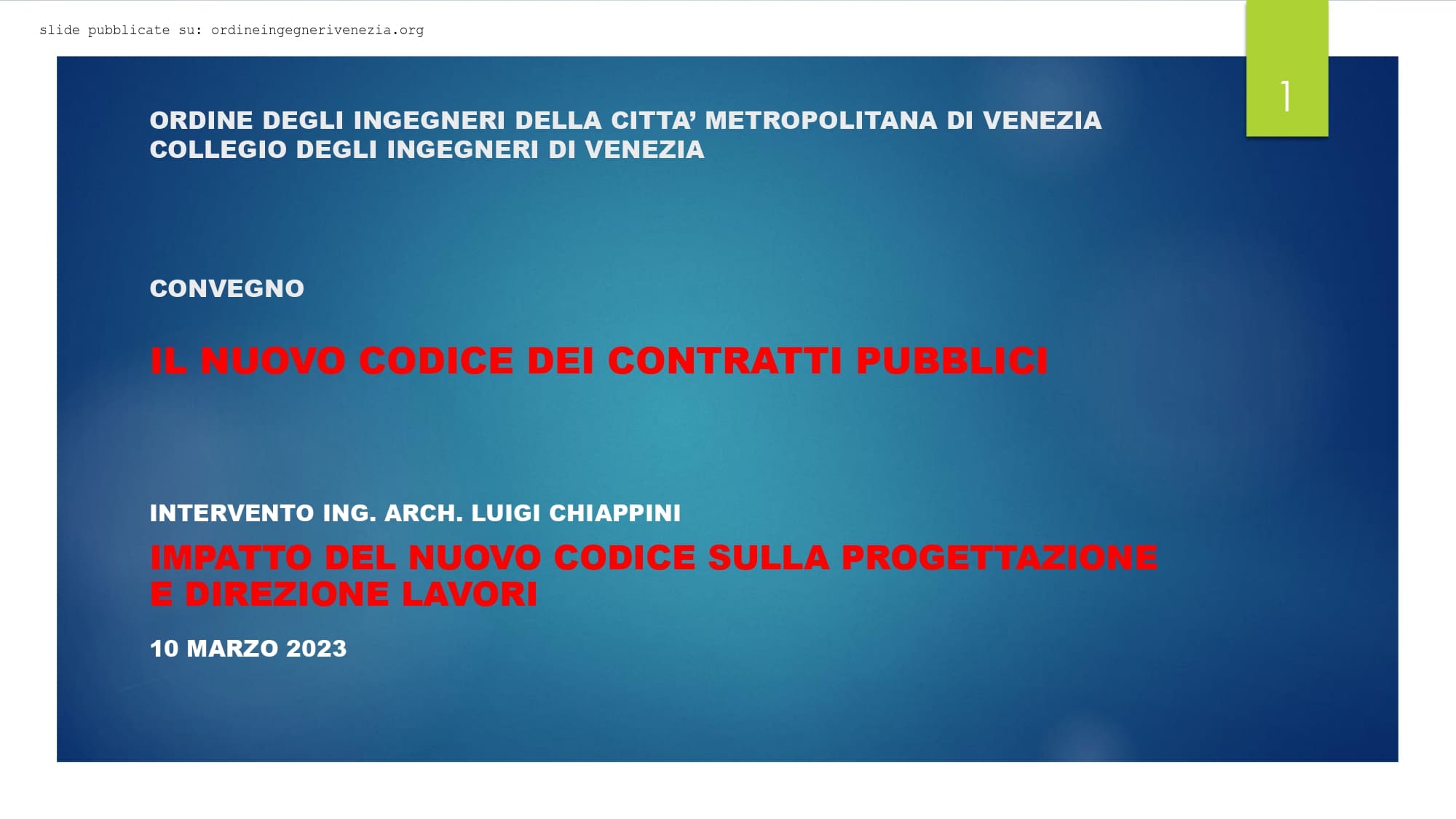 Proponiamo le slide (in file pdf e galleria immagini) con un primo video di sintesi del Convegno sul Nuovo Codice dei Contratti Pubblici, organizzato il 10 marzo 2023 dall’Ordine Ingegneri Venezia insieme al Collegio Ingegneri Venezia e la Fondazione Ingegneri Veneziani.