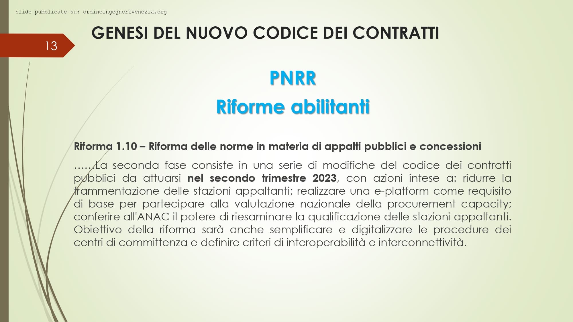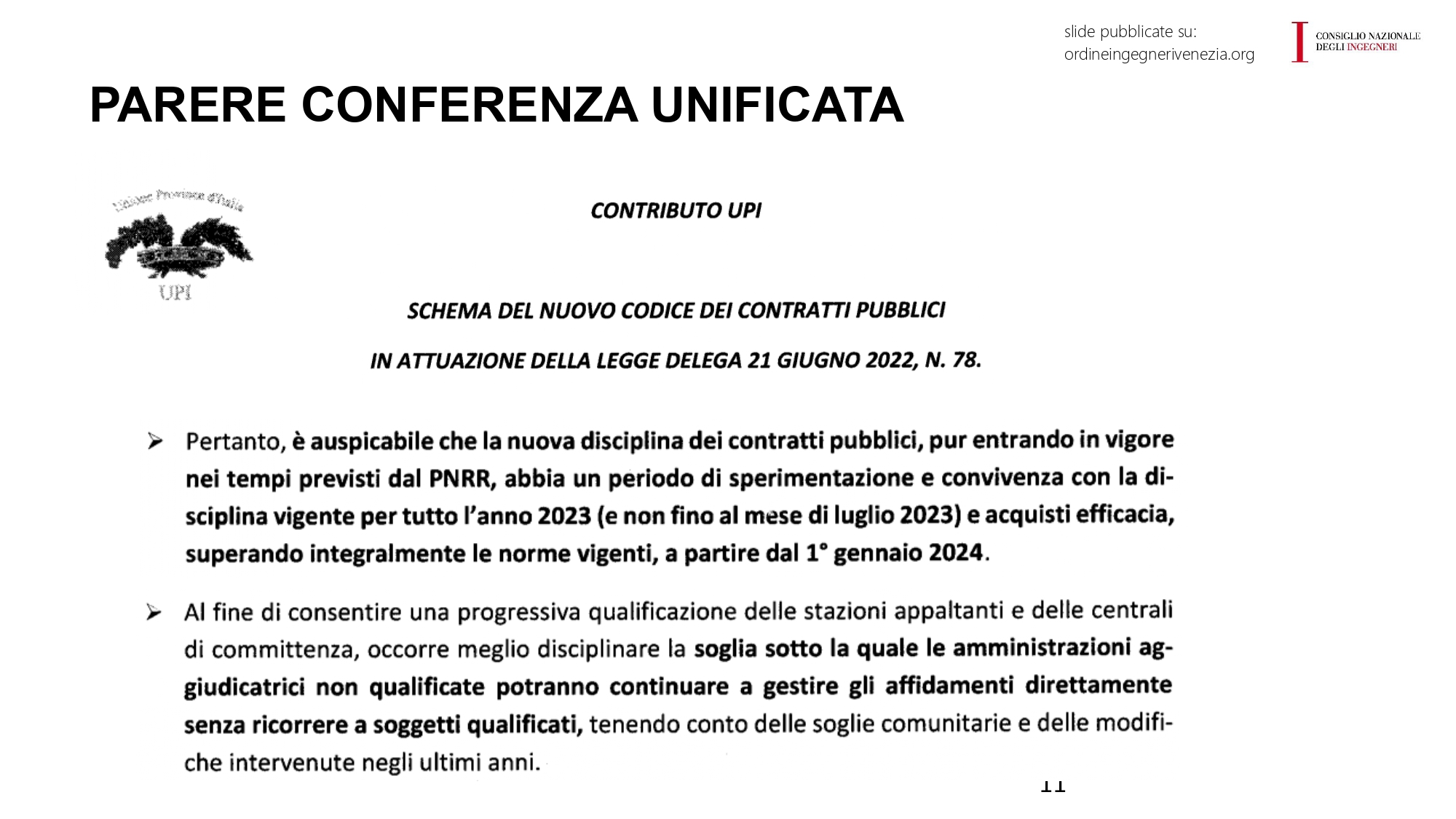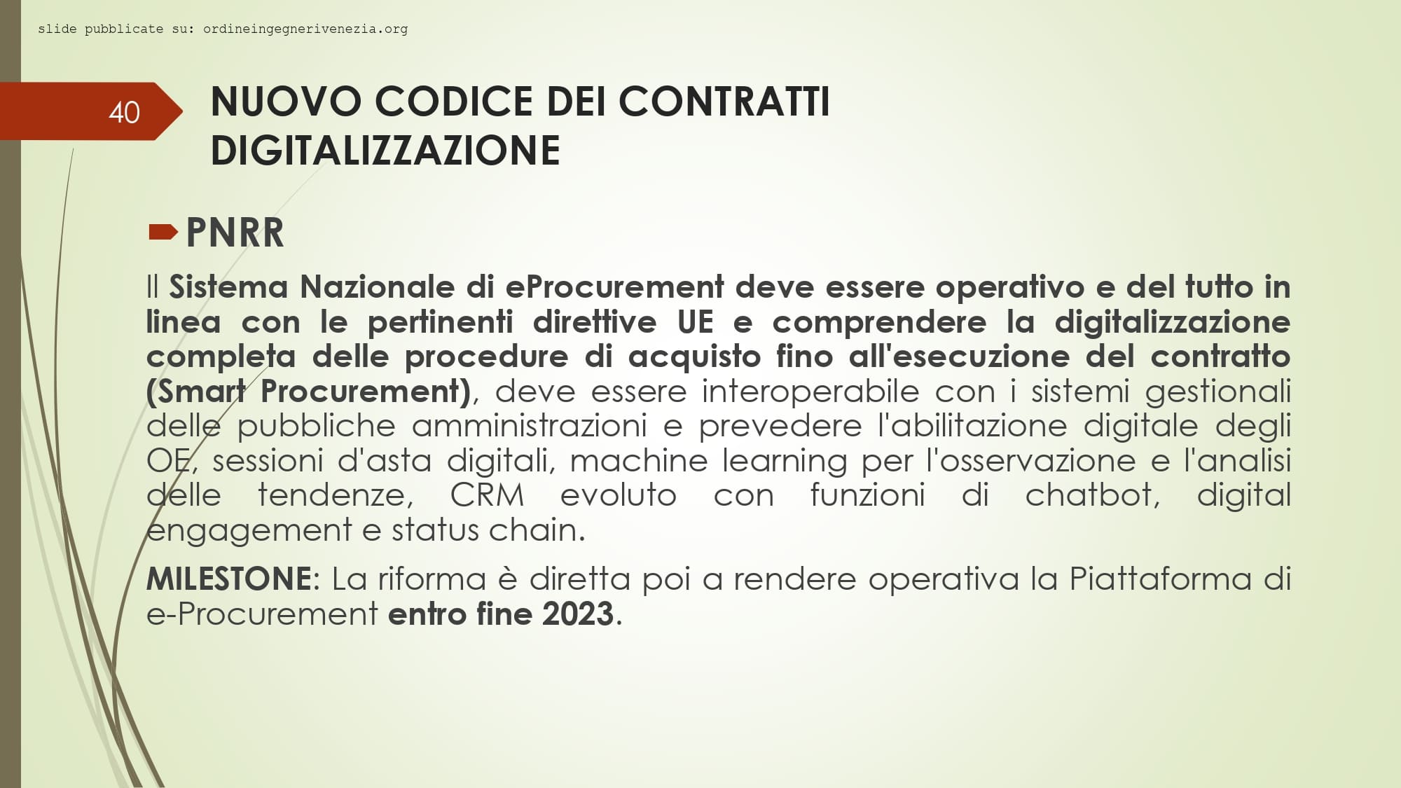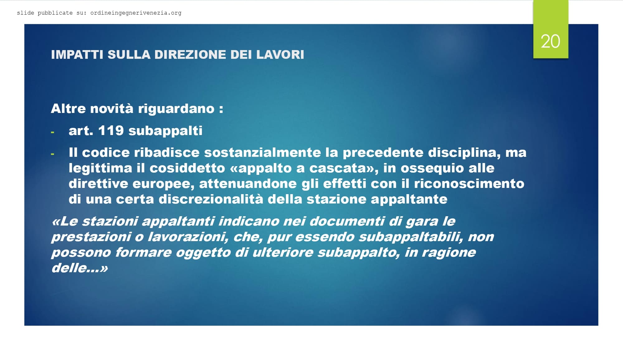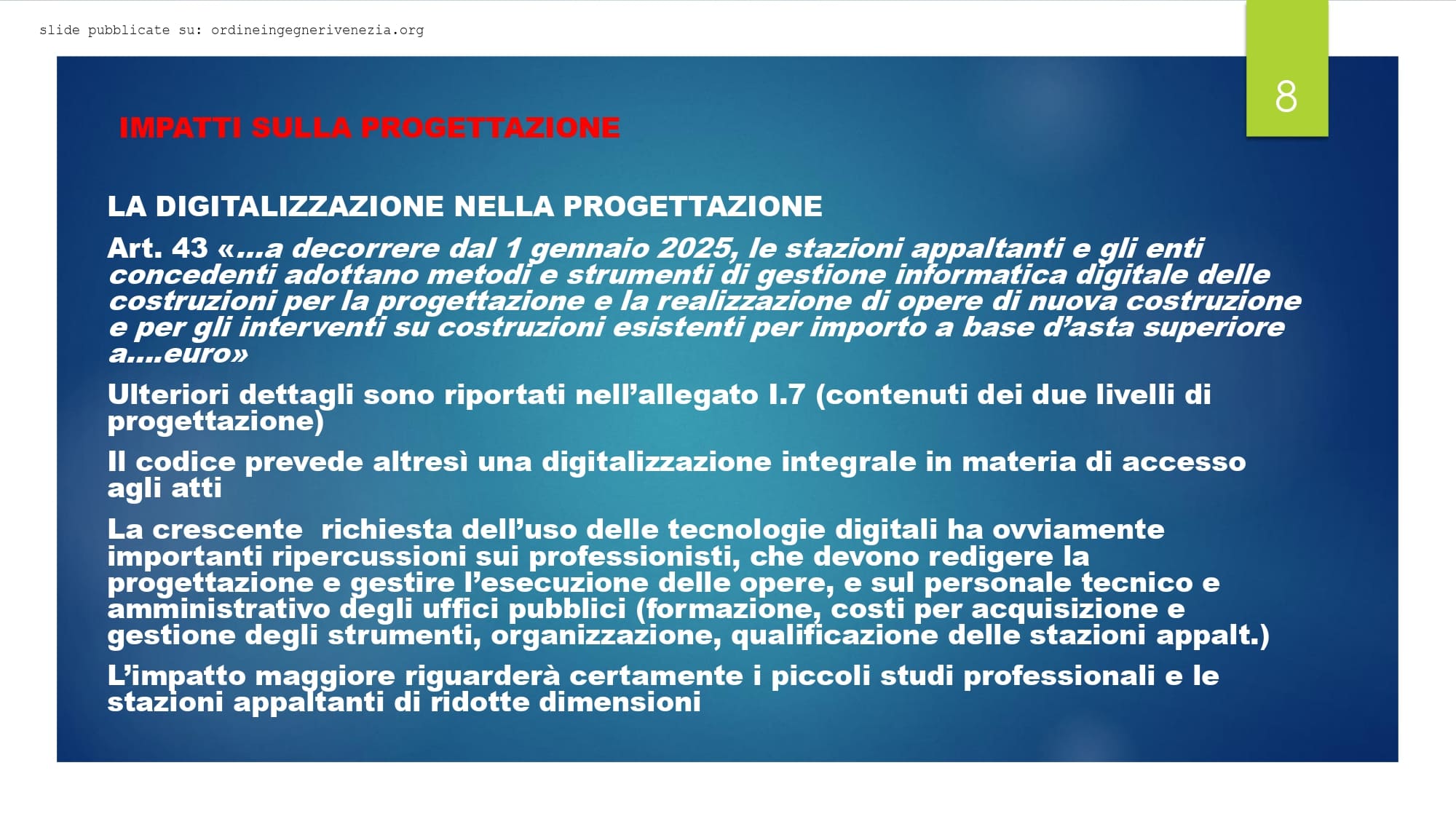 Proponiamo le slide (in file pdf e galleria immagini) con un primo video di sintesi del Convegno sul Nuovo Codice dei Contratti Pubblici, organizzato il 10 marzo 2023 dall’Ordine Ingegneri Venezia insieme al Collegio Ingegneri Venezia e la Fondazione Ingegneri Veneziani.