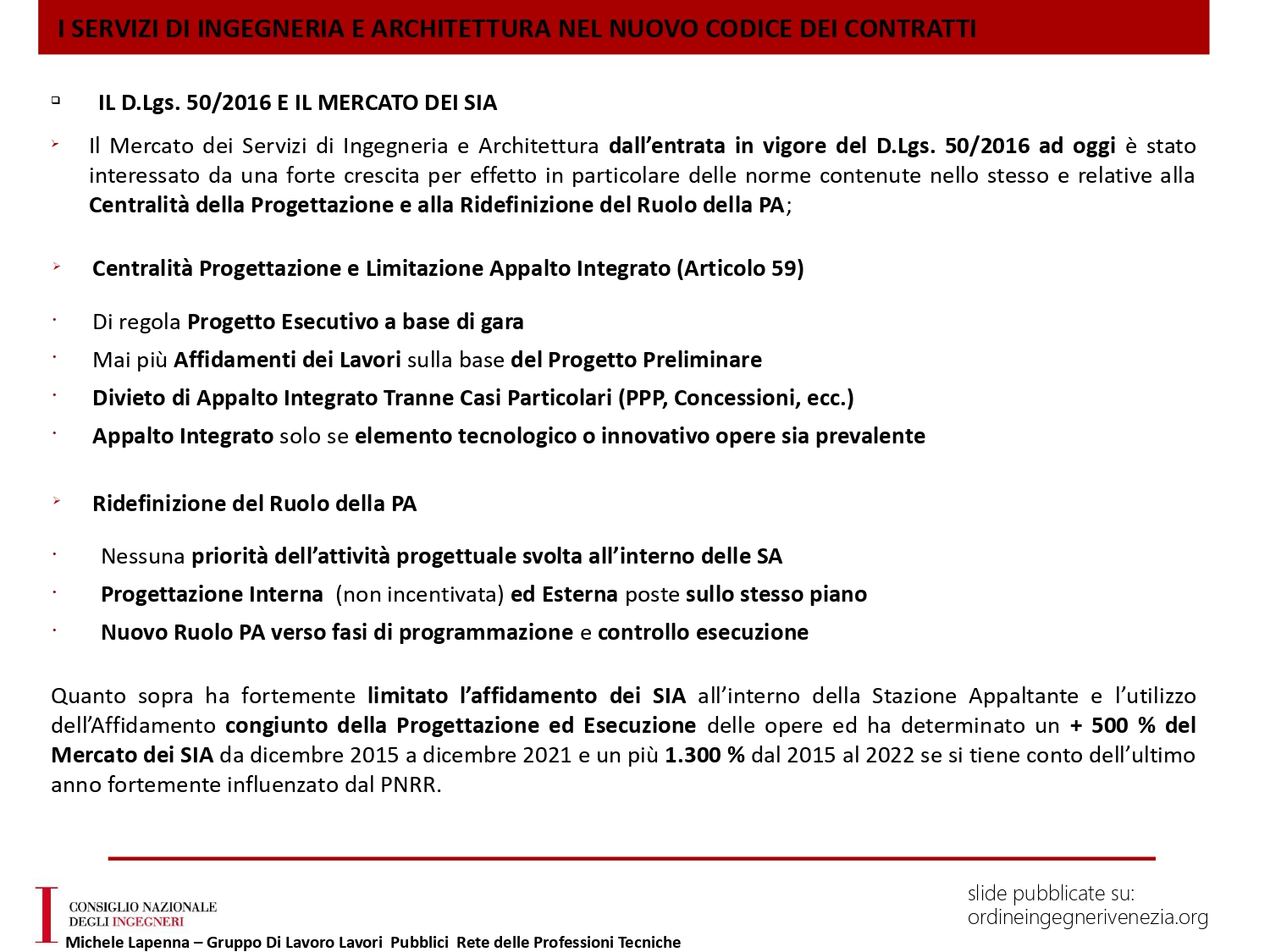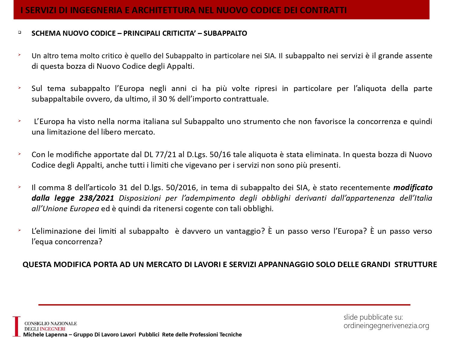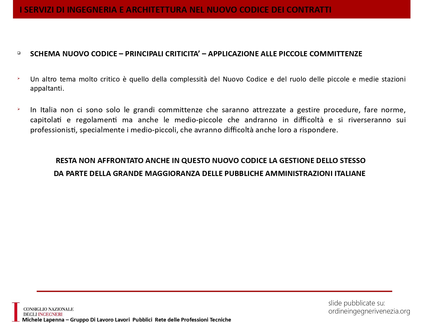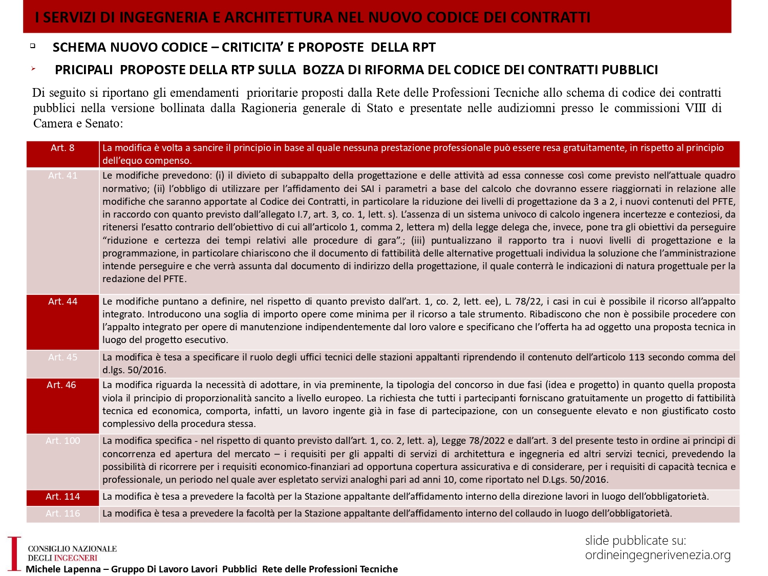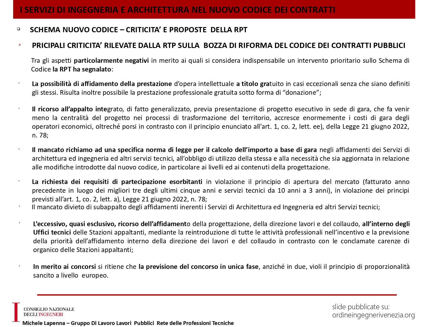 Ing. Michele LAPENNA – Coordinatore G.d.L. Lavori Pubblici Rete delle Professioni Tecniche