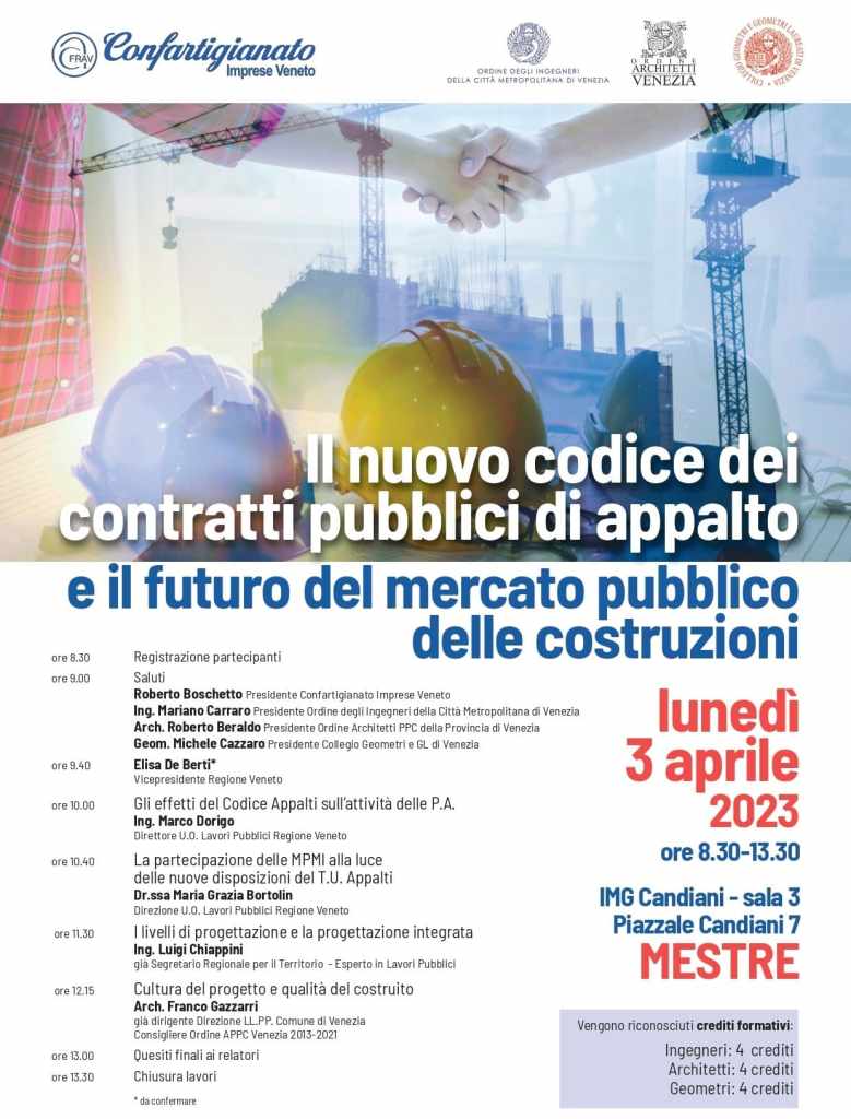 L’Ordine degli Ingegneri della Città Metropolitana di Venezia e la Fondazione Ingegneri Veneziani, in collaborazione con Confartigianato Imprese Veneto, l’Ordine degli Architetti Pianificatori, Paesaggisti e Conservatori della Provincia di Venezia e il Collegio dei Geometri e GL di Venezia, organizzano il seminario gratuito “Il Nuovo Codice dei contratti pubblici di appalto e il futuro del mercato pubblico delle costruzioni” che si terrà a Mestre Venezia il 3 aprile 2023 dalle ore 8:30 alle 13:30 presso IMG Candiani – Sala 3 – Piazzale Candiani, 7.