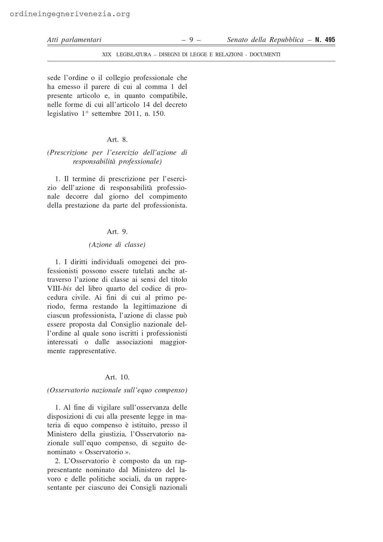 La relatrice, sen. Stefani (LSP), ha riferito sul contenuto del provvedimento che consta di 13 articoli. L’articolo 1 contiene la definizione di equo compenso: per essere considerato equo, il compenso deve essere proporzionato alla quantità e qualità del lavoro svolto, al contenuto e alle caratteristiche della prestazione professionale, e conforme ai parametri per la determinazione dei compensi. Questi ultimi sono previsti, rispettivamente: per gli avvocati, dal regolamento per la professione forense; per gli altri professionisti iscritti a ordini o collegi, dai regolamenti di determinazione dei parametri stabiliti con decreto del Ministro vigilante la professione; per gli esercenti professioni non organizzate in ordini o collegi, da decreti del Ministro dello sviluppo economico, adottati sentite le associazioni professionali. L’articolo 2 definisce, al comma 1, l’ambito oggettivo della nuova disciplina, la quale si applica al compenso dei professionisti in relazione alle attività professionali che: hanno ad oggetto la prestazione d’opera intellettuale; trovano fondamento in convenzioni; sono svolte in favore di imprese bancarie e assicurative, e di imprese che nell’anno precedente al conferimento dell’incarico hanno occupato alle proprie dipendenze più di 50 lavoratori o hanno presentato ricavi annui superiori a 10 milioni di euro. Il comma 2, inoltre, specifica che le norme sull’equo compenso si applicano ad ogni tipo di accordo preparatorio o definitivo, purché vincolante per il professionista, le cui clausole siano utilizzate dalle imprese. Il comma 3 estende l’applicazione della disciplina dell’equo compenso alle prestazioni rese dal professionista nei confronti della pubblica amministrazione e delle società a partecipazione pubblica. L’articolo 3 stabilisce la nullità delle clausole che non prevedono un compenso equo e proporzionato per lo svolgimento di attività professionali, con riguardo anche ai costi sostenuti dal prestatore d’opera. La disposizione reca una puntuale elencazione di tipologie di pattuizioni da considerarsi nulle. L’articolo 4 ribadisce che spetta al giudice, rilevato il carattere iniquo del compenso, rideterminarlo condannando il committente al pagamento del dovuto; inoltre, il giudice può condannare il cliente al pagamento di un indennizzo in favore del professionista. L’articolo 5, comma 1, prevede che gli accordi vincolanti per il professionista conclusi tra quest’ultimo e le imprese di cui all’articolo 2 si presumono unilateralmente predisposti dalle imprese stesse, salvo prova contraria. Il comma 3 stabilisce che i parametri per la determinazione dei compensi professionali debbano essere aggiornati con cadenza biennale, su proposta dei consigli nazionali delle professioni. Il comma 4 attribuisce ai consigli nazionali delle professioni la legittimazione ad agire in giudizio in caso di violazione delle disposizioni in materia di equo compenso. Il comma 5 demanda agli ordini e collegi professionali il compito di introdurre norme deontologiche per sanzionare il professionista che viola le disposizioni sull’equo compenso. L’articolo 9 consente la tutela dei diritti individuali omogenei dei professionisti attraverso l’azione di classe, proposta dal consiglio nazionale dell’ordine (per le professioni ordinistiche) o dalle associazioni professionali (per le professioni non ordinistiche). L’articolo 10 istituisce presso il Ministero della giustizia l’Osservatorio nazionale sull’equo compenso, con il compito di vigilare sul rispetto della legge. L’articolo 11 contiene una disposizione transitoria in base alla quale le norme di nuova introduzione si applicano anche alle convenzioni già stipulate e ancora in corso alla data di entrata in vigore della riforma. L’articolo 12 dispone una serie di abrogazioni, mentre l’articolo 13 reca la clausola di invarianza finanziaria.