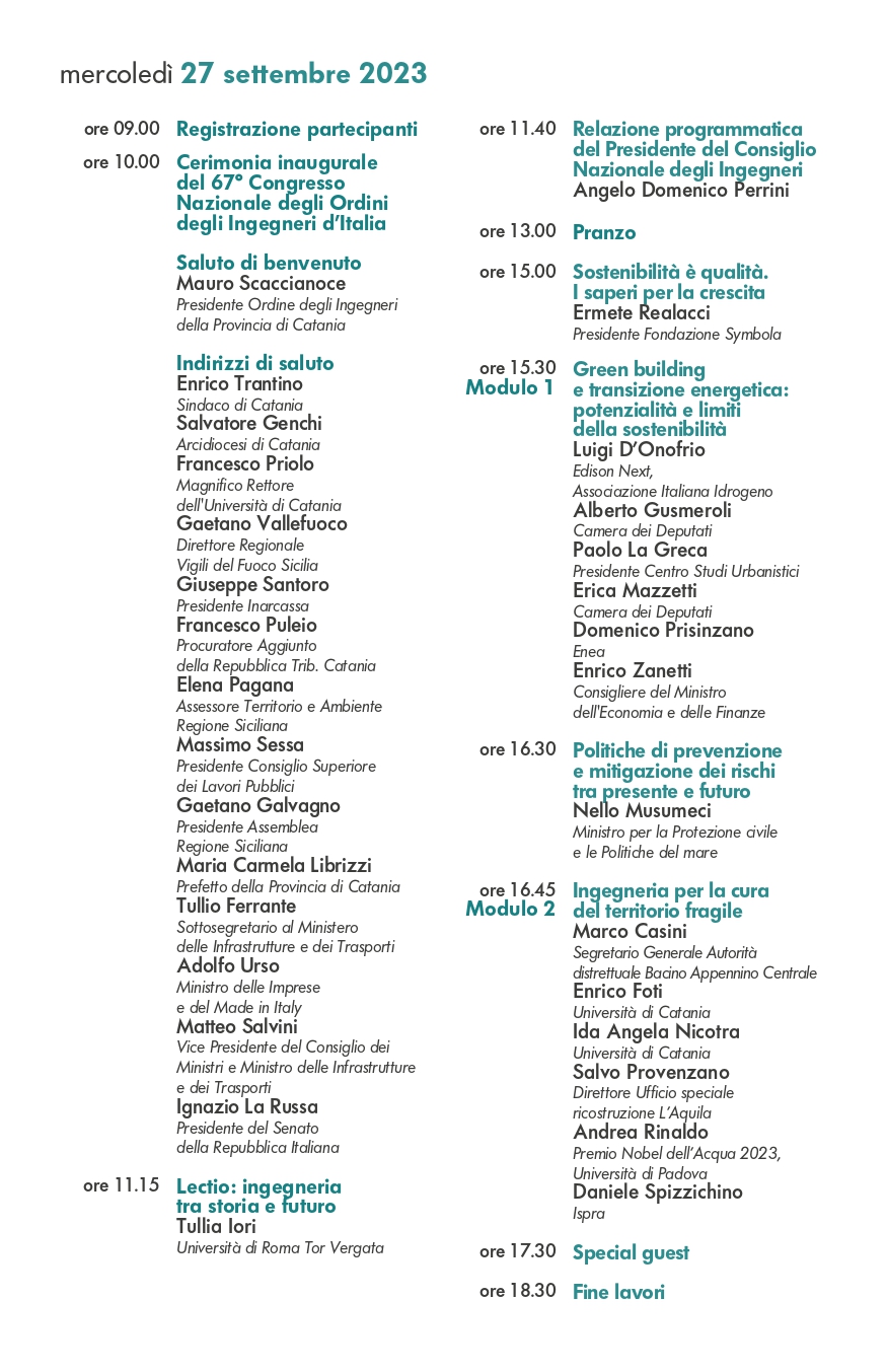 Presenti tre ministri: Musumeci, protezione civile, dal vivo; Urso, imprese e made in Italy, e Salvini, infrastrutture, da remoto. Tutti con interventi concreti e di merito, a testimonianza dell’interesse e dell’attenzione che il mondo dell’ingegneria può e deve suscitare al massimo livello di governance del nostro Paese. Merito indubbio del Consiglio Nazionale Ingegneri e del Presidente nazionale, Mimmo Perrini ai quali vanno sentiti ringraziamenti.