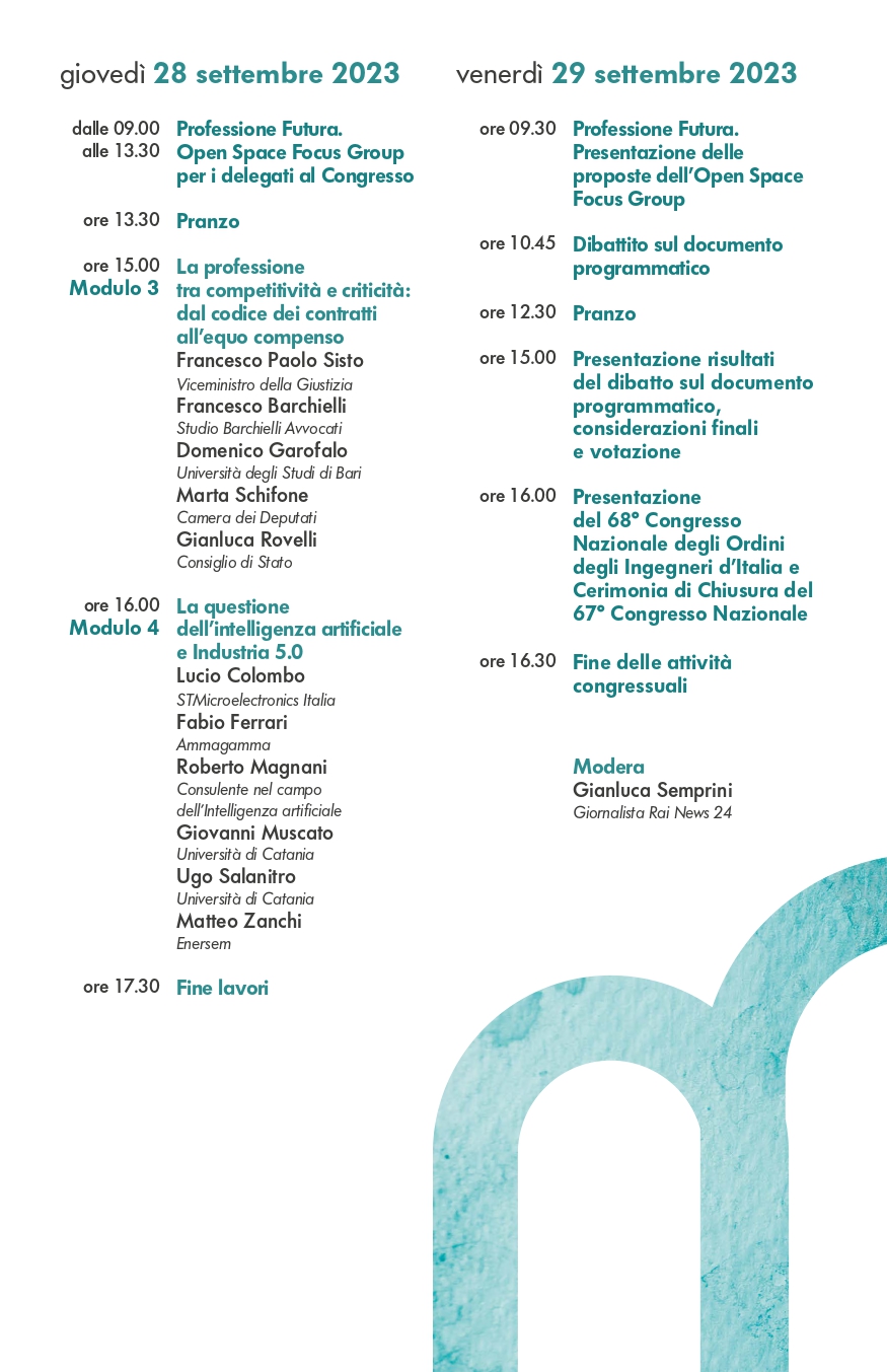 Il quarto modulo, infine, tratterà il tema dell’intelligenza artificiale e industria 5.0. Il dibattito cercherà di rispondere a domande quali il ruolo dell’ingegneria nei processi di automazione delle linee produttive, anche in un’ottica di sostenibilità ambientale; l’impatto dell’Intelligenza artificiale nell’esercizio della libera professione; quali opportunità, nel nostro Paese, per un uso intenso della robotica collaborativa nei processi industriali.