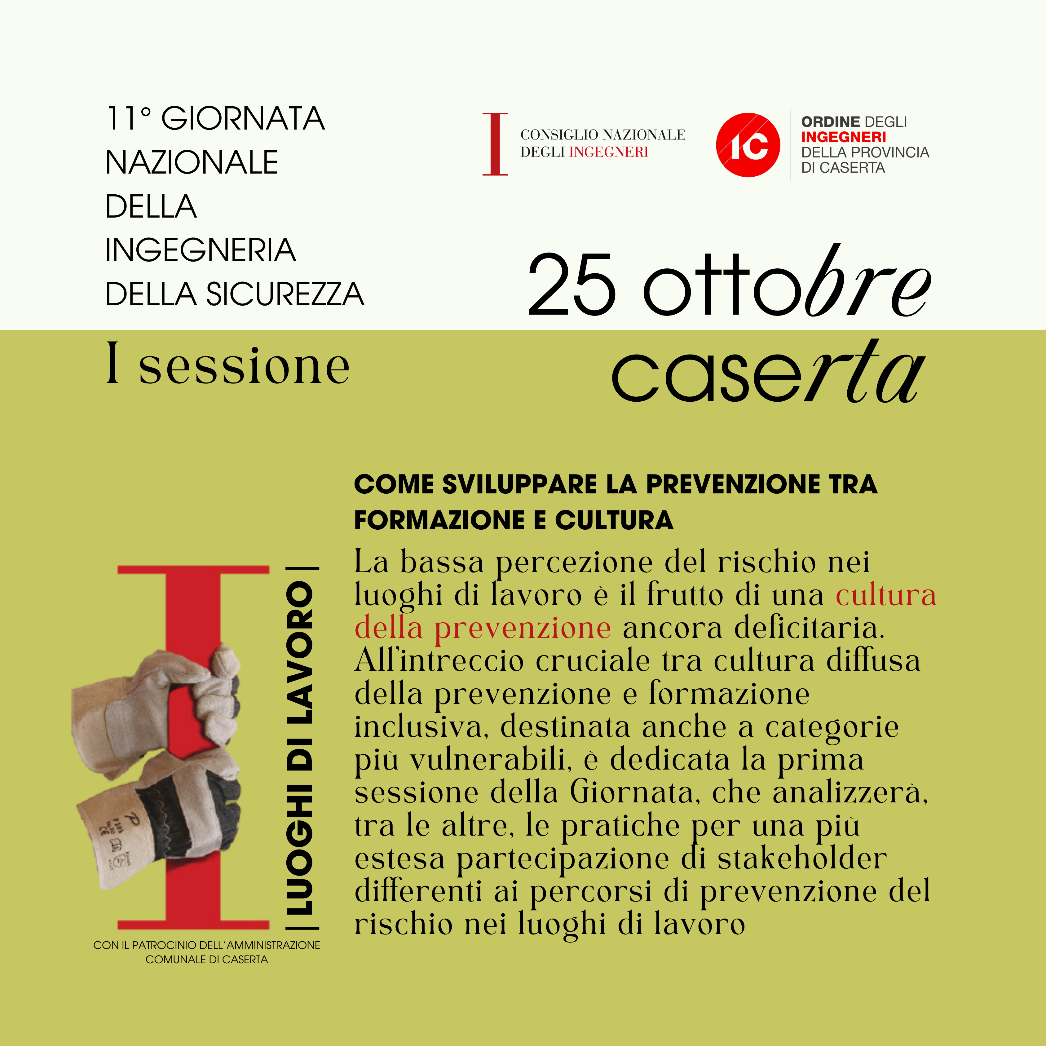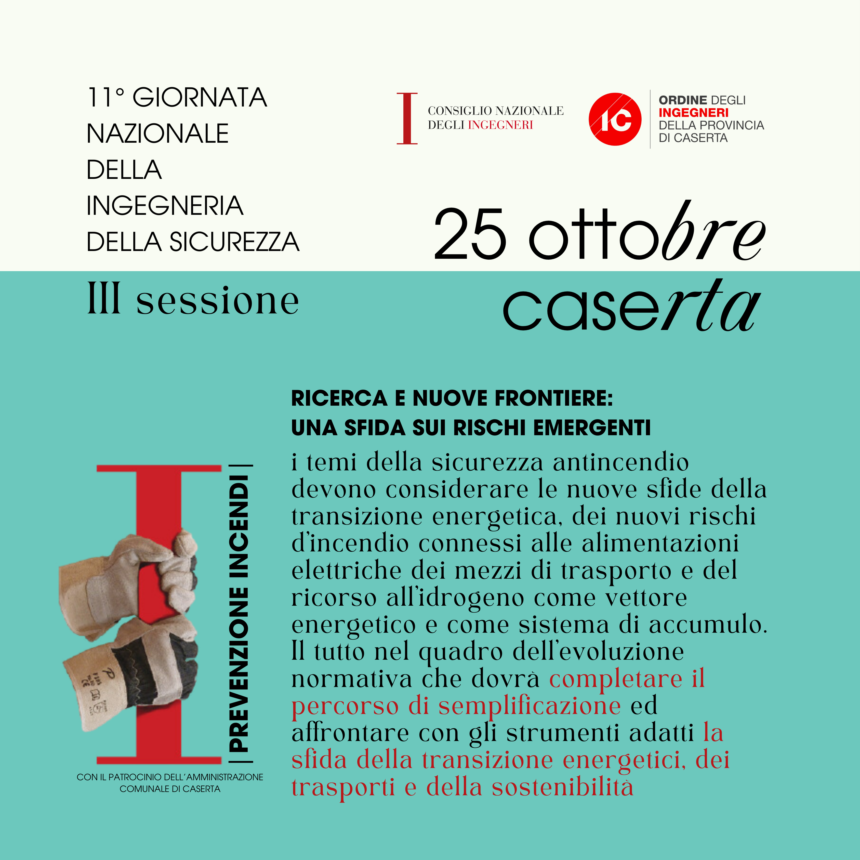 25 ottobre, una data importante da fissare in agenda perchè si svolge l’11ª Giornata Nazionale dell’Ingegneria della Sicurezza GNIS. Evento in presenza e in remoto presso il Belvedere di San Leucio a Caserta (orario 9:00-18:00) organizzato dal Consiglio Nazionale Ingegneri e dall’Ordine Ingegneri della provincia di Caserta, collaborazione Fondazione CNI e Patrocinio Comune di Caserta.
