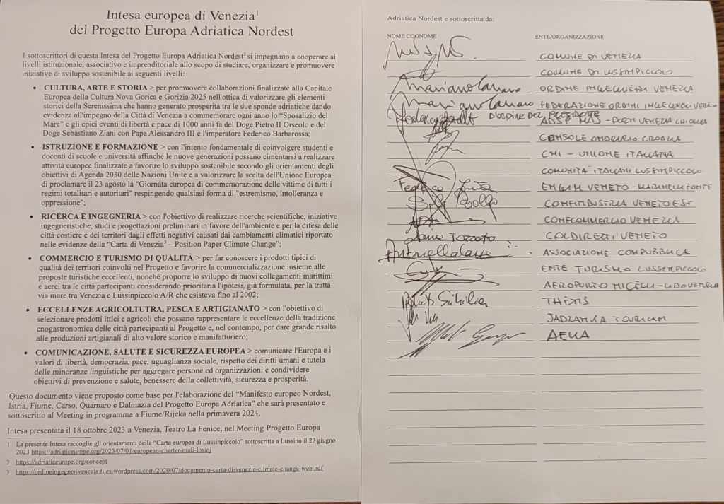 18 enti e organizzazioni del Nordest hanno sottoscritto il 18 ottobre a Venezia l’Intesa Europa Adriatica al Meeting che si è svolto in tre giorni tra Palazzo Cornoldi, il Teatro La Fenice, l’Arsenale, il MoSE e l’Aeroporto Nicelli del Lido. Supporto del Comune di Venezia, Ordine Ingegneri Venezia, Autorità di Sistema Portuale del Mare Adriatico Settentrionale e molti partner.