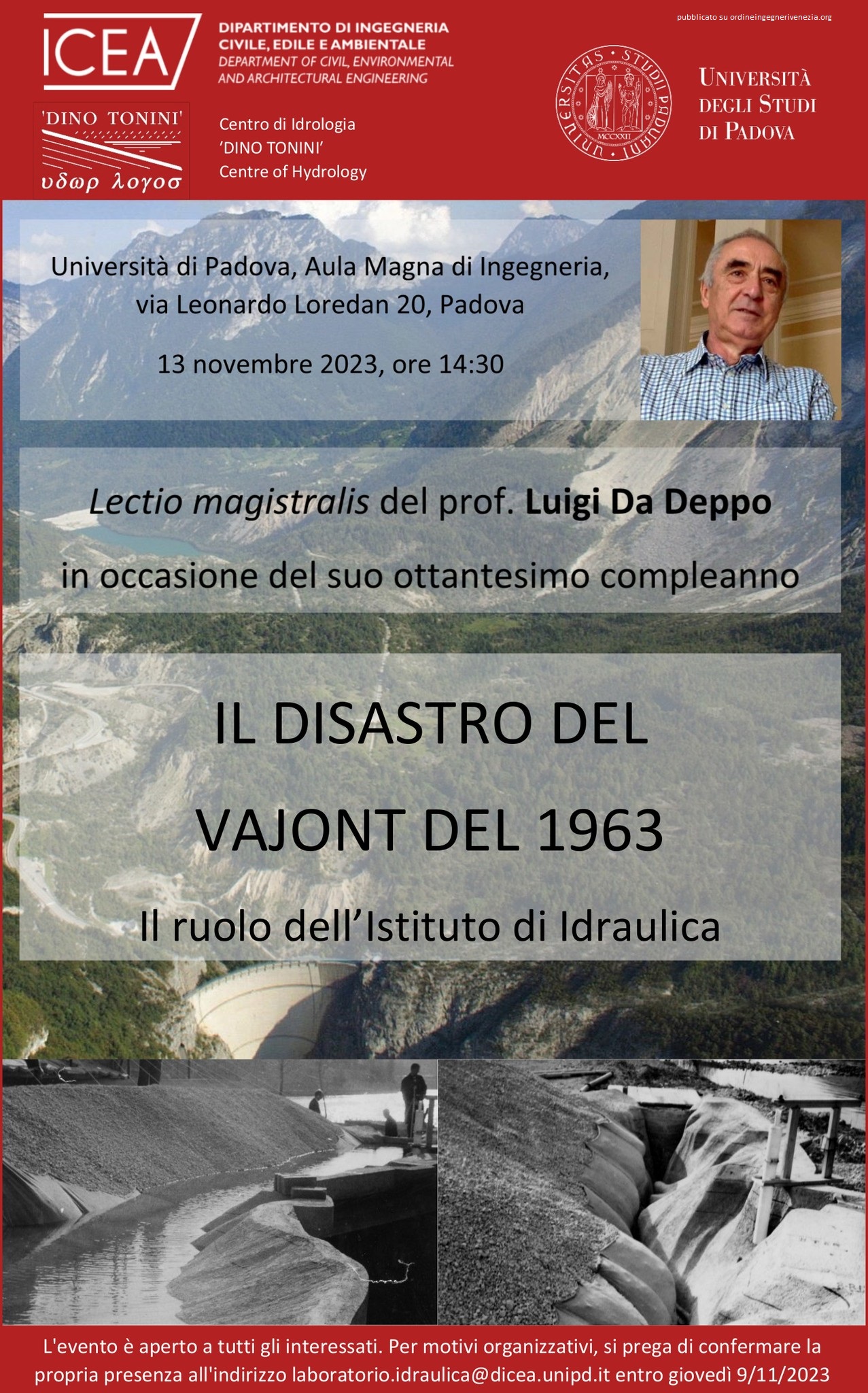 Vajont, a 60 anni dall’evento catastrofico il Centro di Idrologia “Dino Tonini” ha invitato il prof. Luigi Da Deppo, professore emerito di Costruzione idrauliche del Dipartimento ICEA, a tenere una lectio magistralis dal titolo “Il disastro del Vajont del 1963. Il ruolo dell’Istituto di Idraulica”.