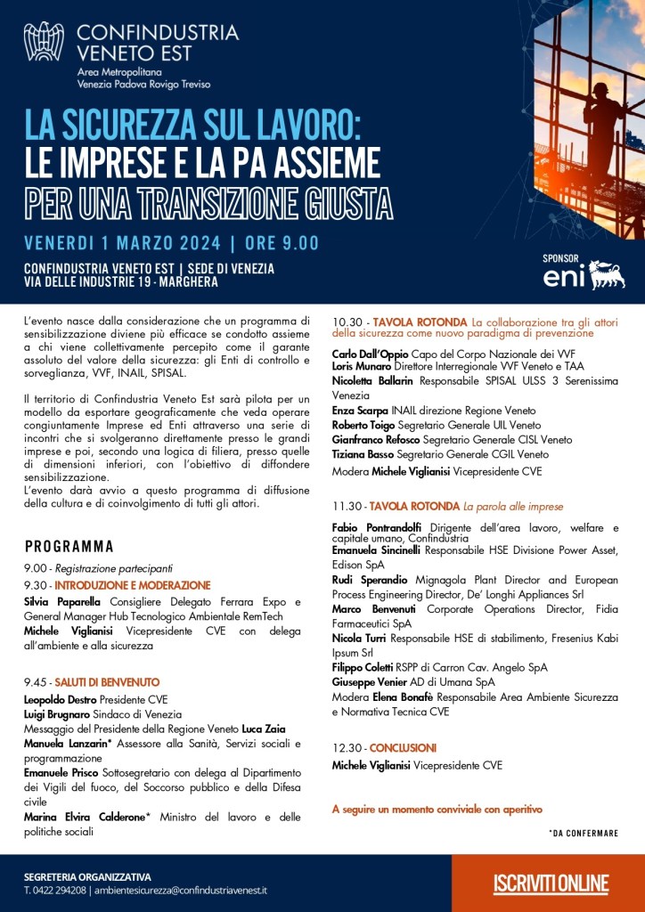 L’Ordine Ingegneri Venezia è stato inviato a partecipare al Convengo La Sicurezza sul Lavoro: le Imprese e la PA assieme per una Transizione Giusta (PDF PROGRAMMA). L’evento è in programma il primo Marzo a Venezia, presso la sede di Confindustria Veneto Est di Venezia – Marghera, Via delle Industrie, 19.