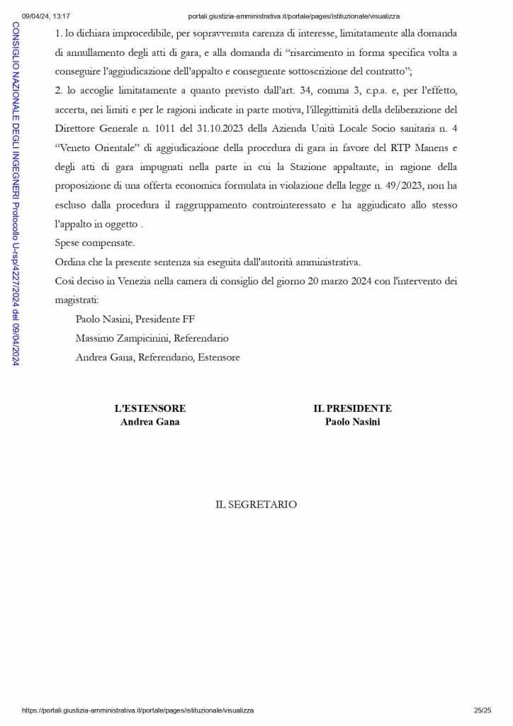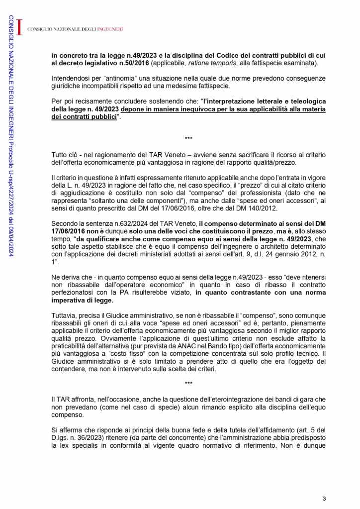 Ecco la Circolare del Consiglio Nazionale Ingegneri con allegata la Sentenza n. 632 del TAR Veneto, III Sezione emessa il 3 aprile 2024. Contiene importantissimi principi in tema di equo compenso e sua incidenza nel settore dei contratti pubblici.