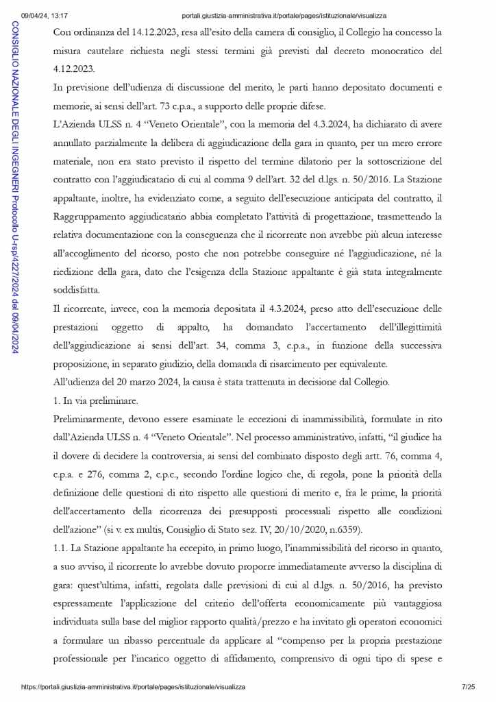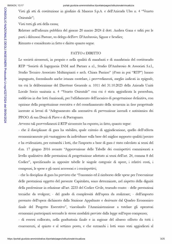 Oggetto del contendere era la legittimità della procedura di gara per l’affidamento di un appalto, sottoposto al regime di cui al previgente d.lgs. n. 50/2016, avente ad oggetto l’affidamento dell’incarico di progettazione definitiva, con opzione della progettazione esecutiva e del coordinamento della sicurezza in fase progettuale inerente ai lavori di “Adeguamento alla normativa di prevenzione incendi e antisismica dei PP.OO. di San Donà di Piave e Portoguaro” da parte della AULSS n.4 “Veneto Orientale”, in base al criterio di aggiudicazione dell’offerta economicamente più vantaggiosa.