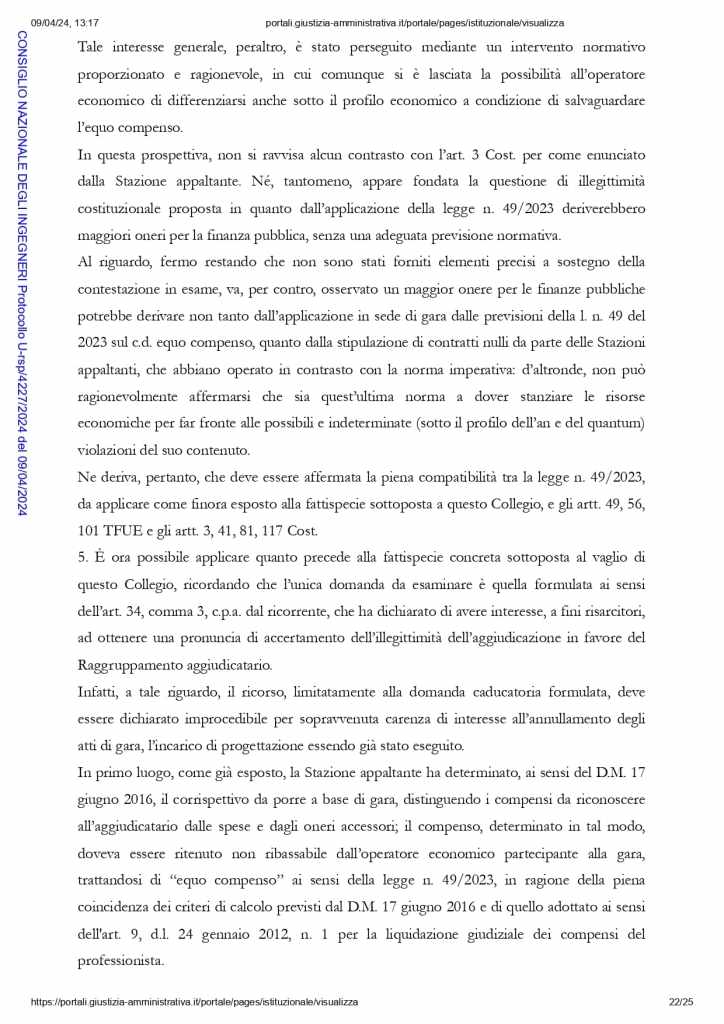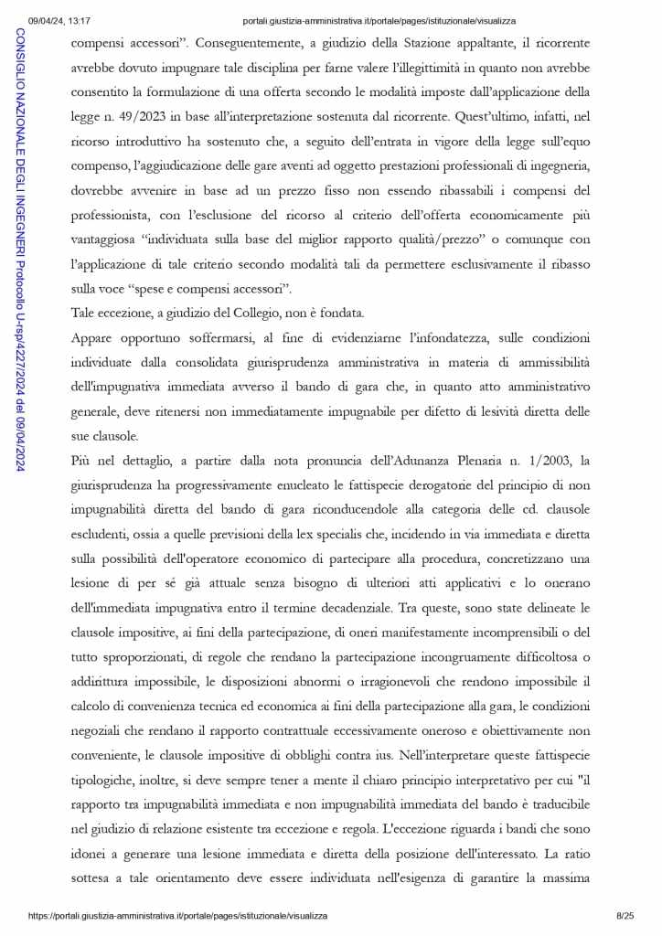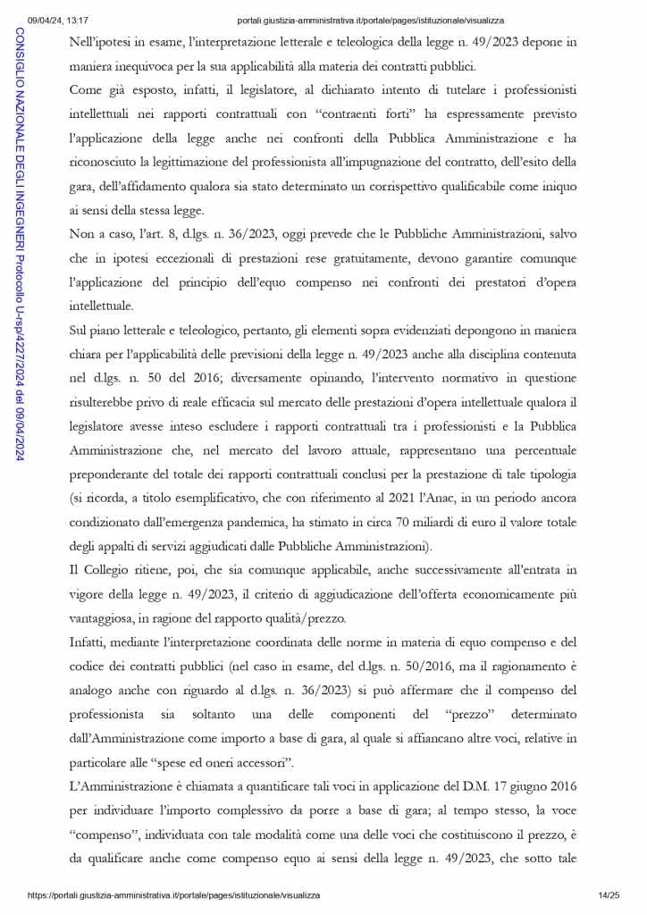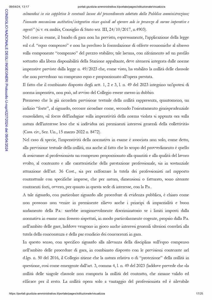 Si tratta di un pronunciamento doppiamente rilevante, sia perché fissa una serie di chiari e solidi punti fermi in materia di inderogabilità e piena efficacia delle disposizioni recate dalla legge 21/04/2023 n.49 (“Disposizioni in materia di equo compenso delle prestazioni professionali”), sia perché conforta e conferma la linea interpretativa sin qui sostenuta dal Consiglio Nazionale degli Ingegneri nelle circolari sull’argomento.
