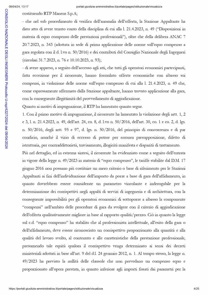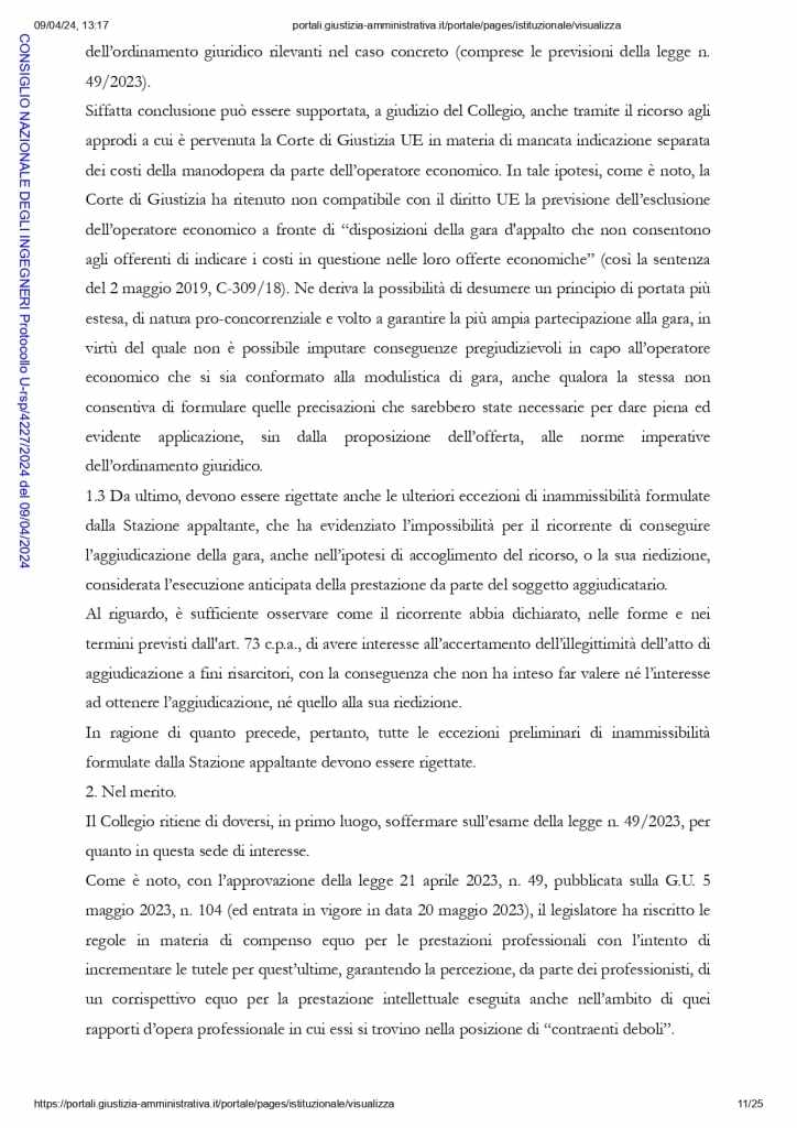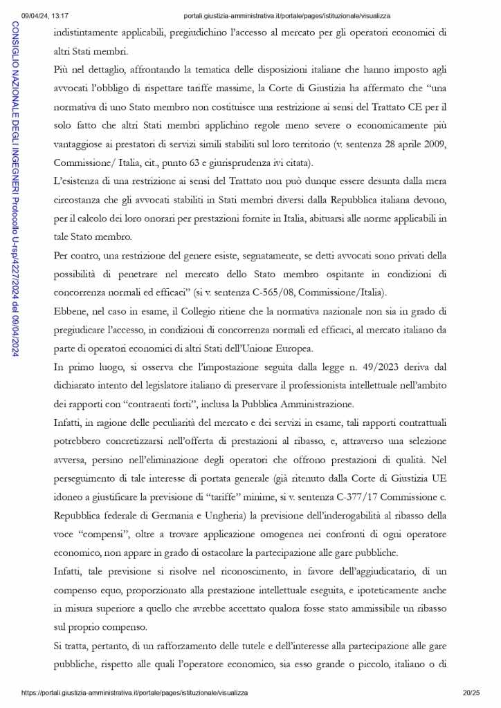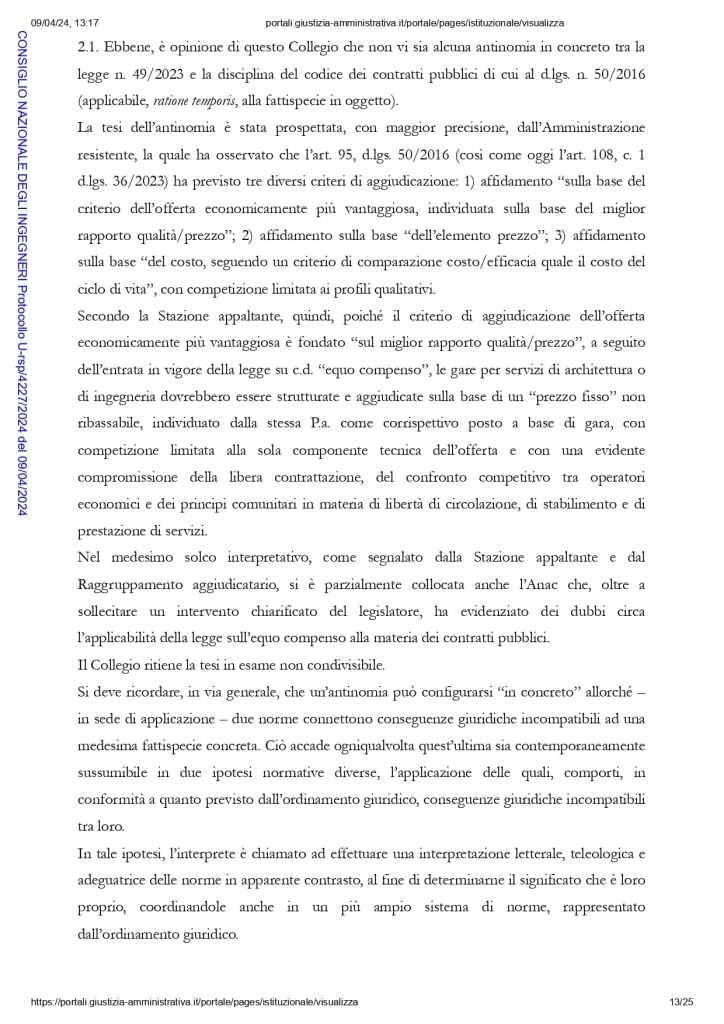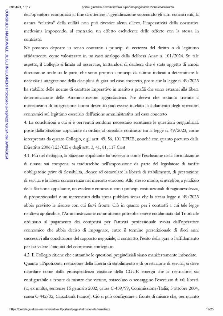 Si tratta di un pronunciamento doppiamente rilevante, sia perché fissa una serie di chiari e solidi punti fermi in materia di inderogabilità e piena efficacia delle disposizioni recate dalla legge 21/04/2023 n.49 (“Disposizioni in materia di equo compenso delle prestazioni professionali”), sia perché conforta e conferma la linea interpretativa sin qui sostenuta dal Consiglio Nazionale degli Ingegneri nelle circolari sull’argomento.
