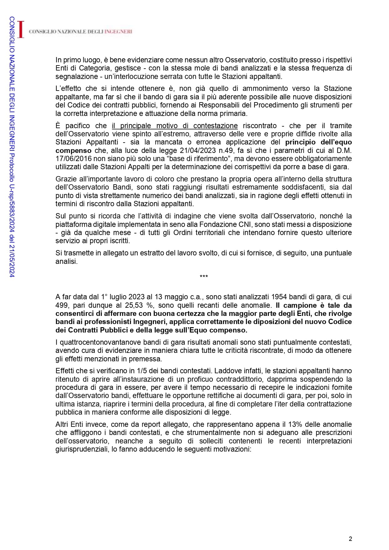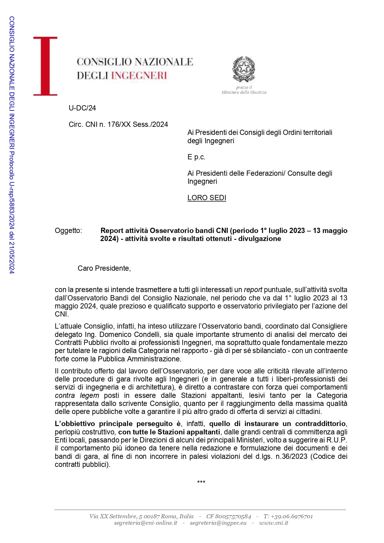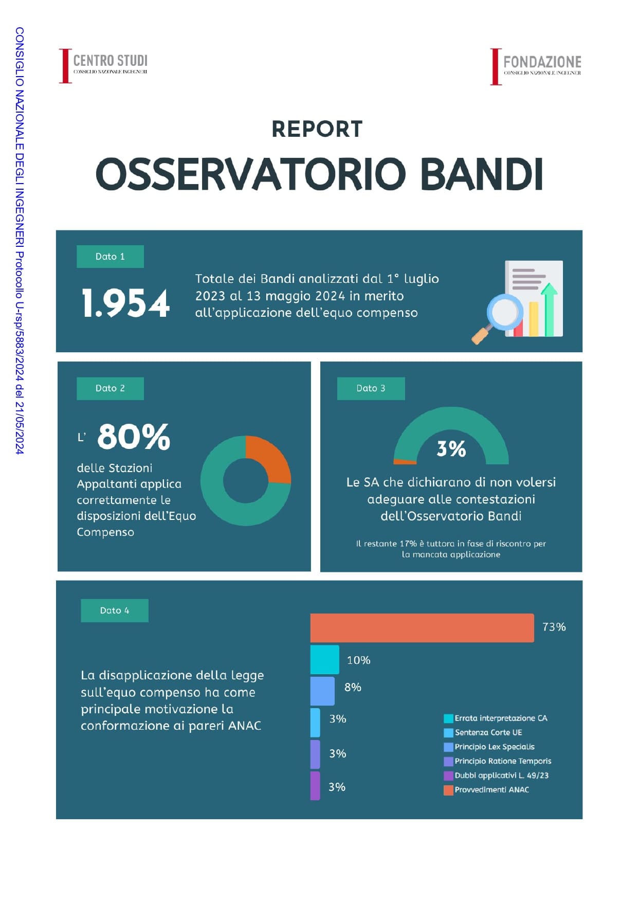 Il Consiglio Nazionale degli Ingegneri ha reso noto (scarica la Circolare in formato PDF) i risultati dell’attività svolta dal suo Osservatorio Bandi, relativamente al periodo che va dal 1° luglio 2023 al 13 maggio 2024. L’analisi, realizzata dal Centro Studi CNI, ha interessato complessivamente 1954 bandi di gara.
