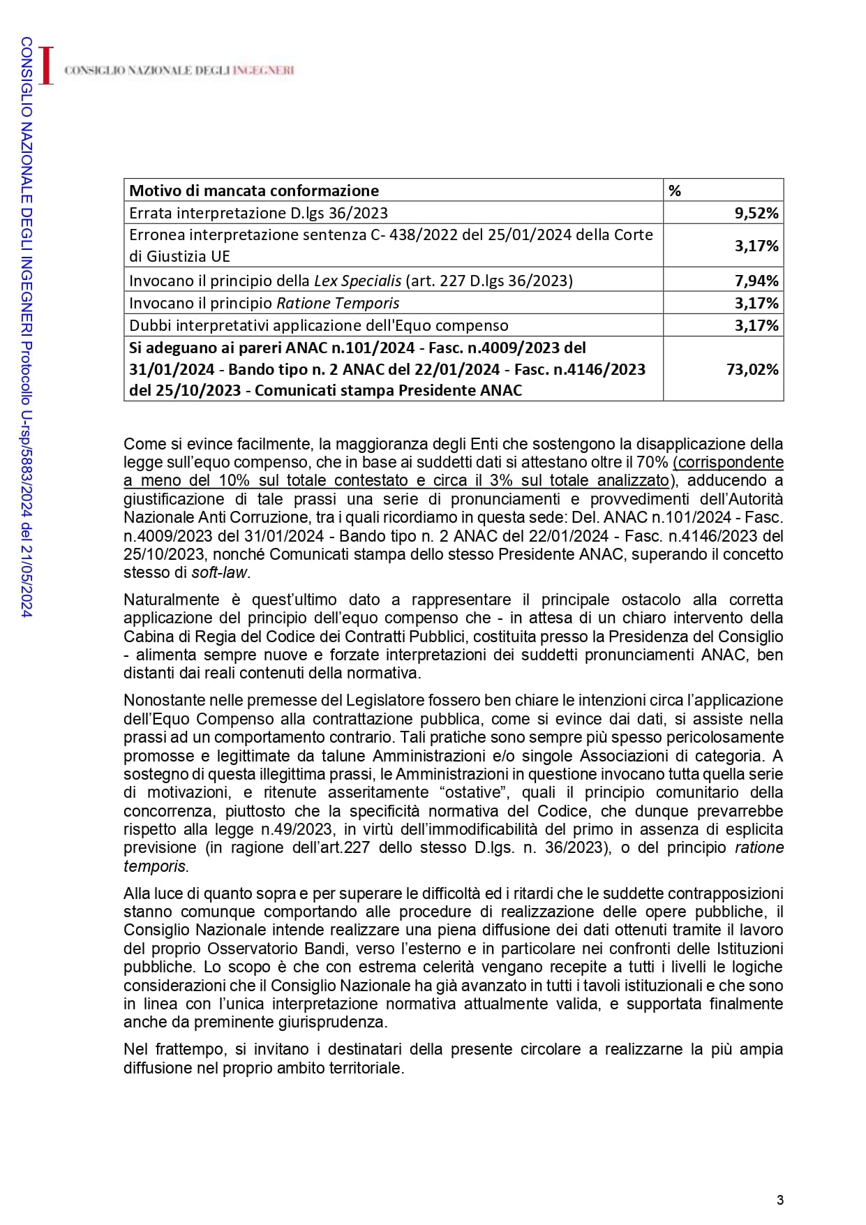 In 499 casi sono state rilevate delle anomalie, pari a circa il 26% del totale. Si può affermare, dunque, che la maggior parte degli Enti che rivolge bandi ai professionisti Ingegneri applica correttamente le diposizioni del nuovo Codice dei Contratti Pubblici e della legge sull’Equo compenso (74% del totale).