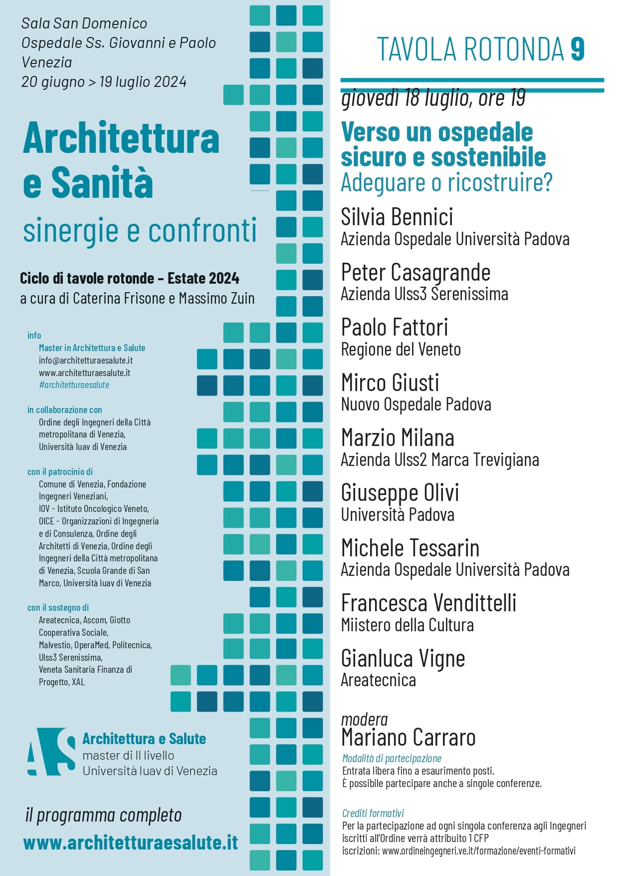 Tutti gli eventi si svolgono all’Ospedale Ss. Giovanni e Paolo di Venezia. Link per iscrizioni e ottenimento dei crediti formativi ordineingegneri.ve.it/formazione/eventi-formativi/#seminari-convegni
