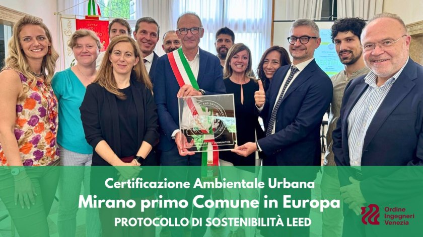 “Congratulazioni alla Città di Mirano che ha ottenuto la Certificazione Ambientale Urbana LEED, l’Ordine Ingegneri Venezia – commenta il Presidente Ing. Mariano Carraro – è onorato dell’importante risultato ottenuto grazie all’eccellente professionalità del nostro Ing. Mauro Roglieri che è anche Coordinatore della Commissione Efficienza Energetica e Transizione Ecologica dell’Ordine Ingegneri Venezia”.