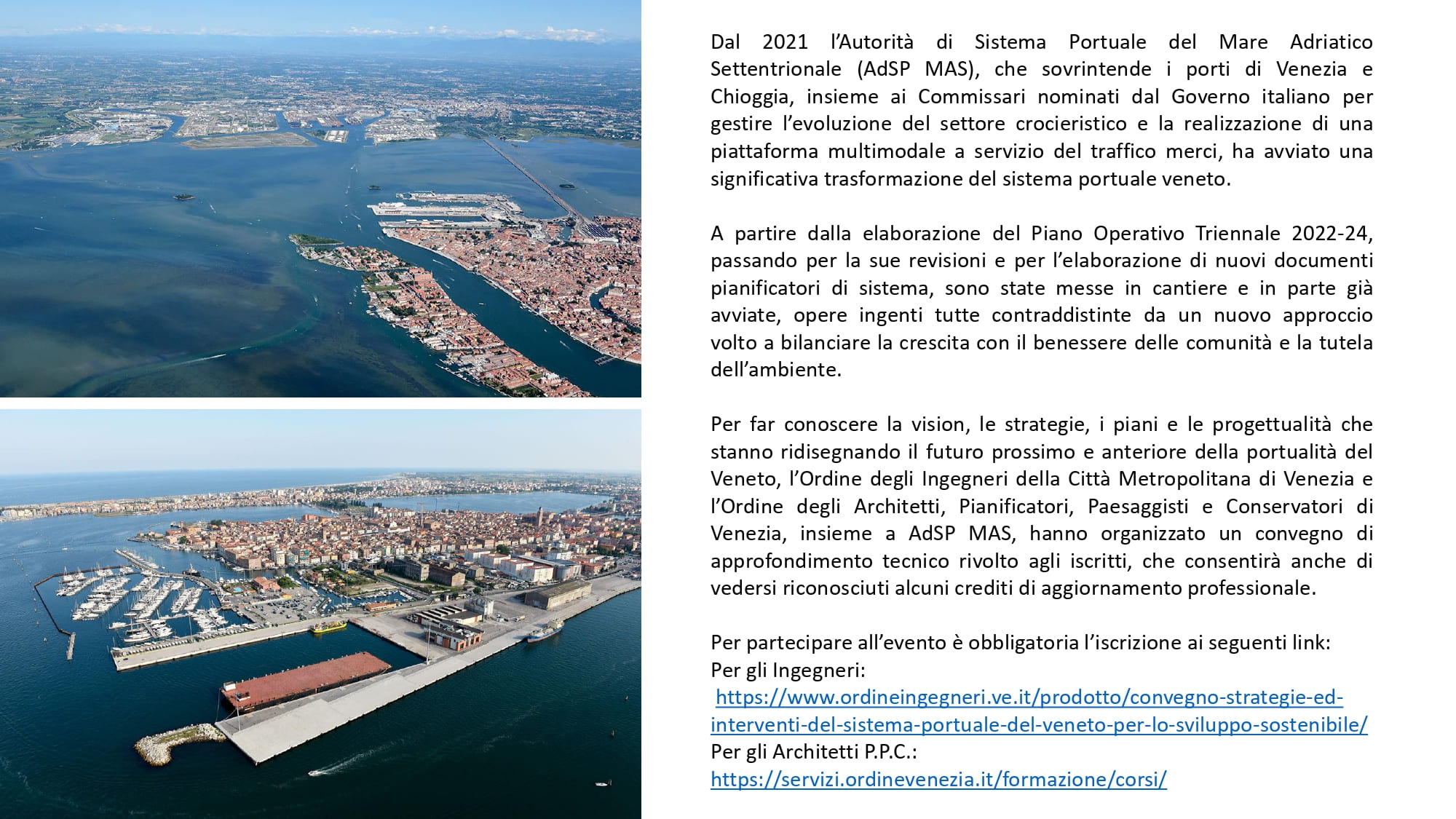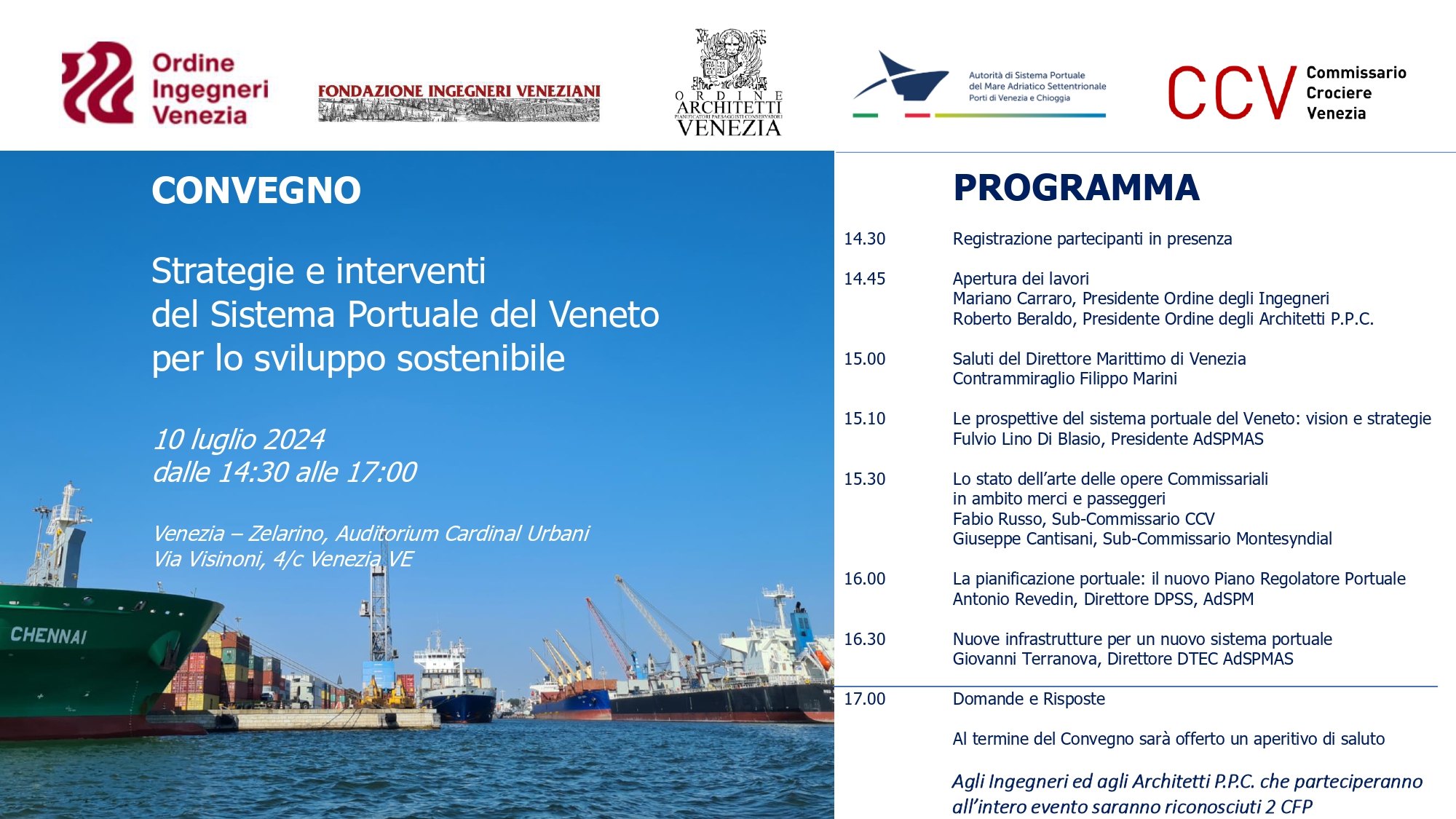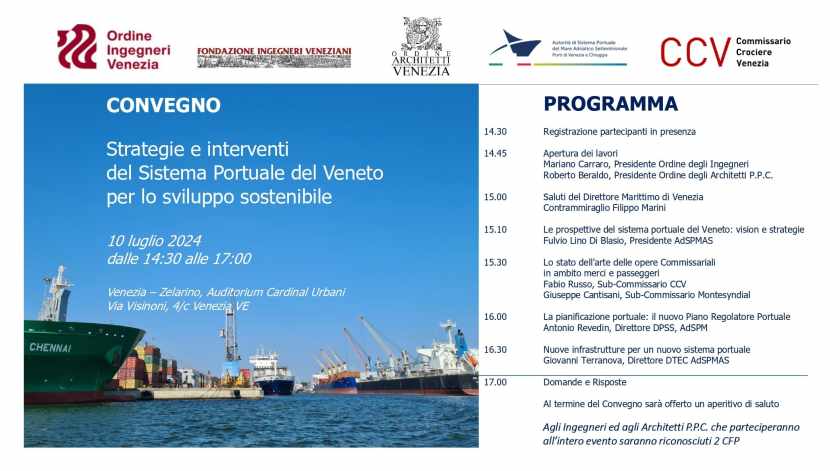 L’Ordine Ingegneri Venezia con la Fondazione Ingegneri Veneziani e l’Ordine degli Architetti P.P.C. Venezia, insieme a AdSP MAS, hanno organizzato il convegno gratuito di approfondimento tecnico sul tema “Strategie e interventi del sistema portuale del Veneto per lo sviluppo sostenibile” che si terrà nella il 10 luglio 2024 dalle ore 14:30 alle 17:00 presso l’Auditorium Cardinal Urbani in Via Visinoni, 4/C Mestre Venezia.