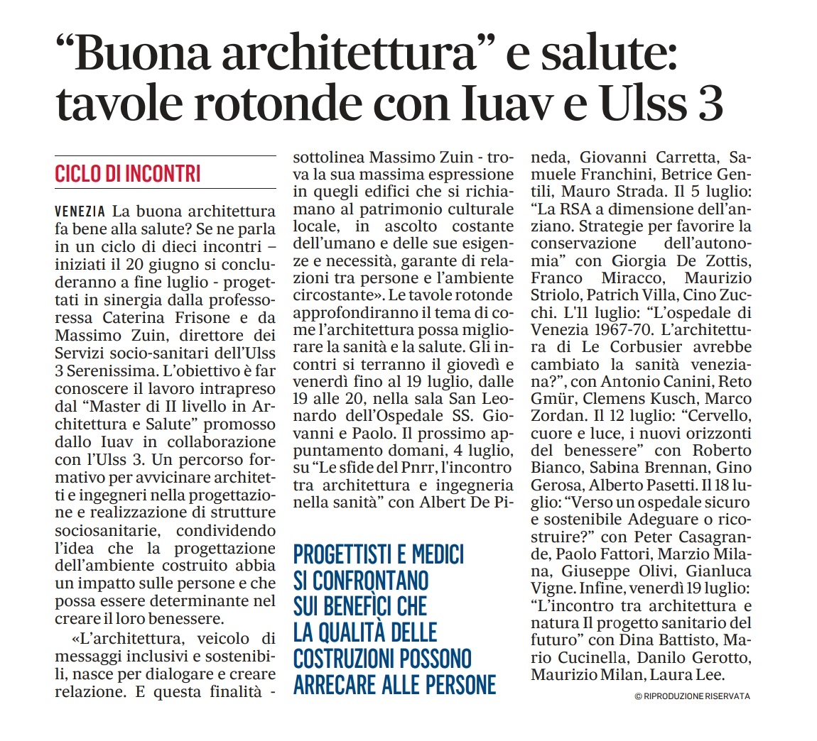 Il Presidente dell’Ordine Ingegneri Venezia ing. Mariano Carraro interverrà sul tema OSPEDALE SICURO E SOSTENIBILE alla tavola rotonda del 18 luglio che si terrà alle ore 19:00 presso la Sala San Domenico dell’Ospedale Ss. Giovanni e Paolo di Venezia.