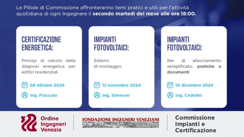 La Commissione Impianti e Certificazione dell’Ordine degli Ingegneri della Città Metropolitana di Venezia e la Fondazione Ingegneri Veneziani organizzano tre webinar gratuiti “PILLOLE DI COMMISSIONE”, di un’ora ciascuno, sul tema energia con focus su certificazione energetica e impianti fotovoltaici. Sono interessanti corsi specialistici online pensati per giovani ingegneri e neo-laureati di età inferiore ai 30 anni.