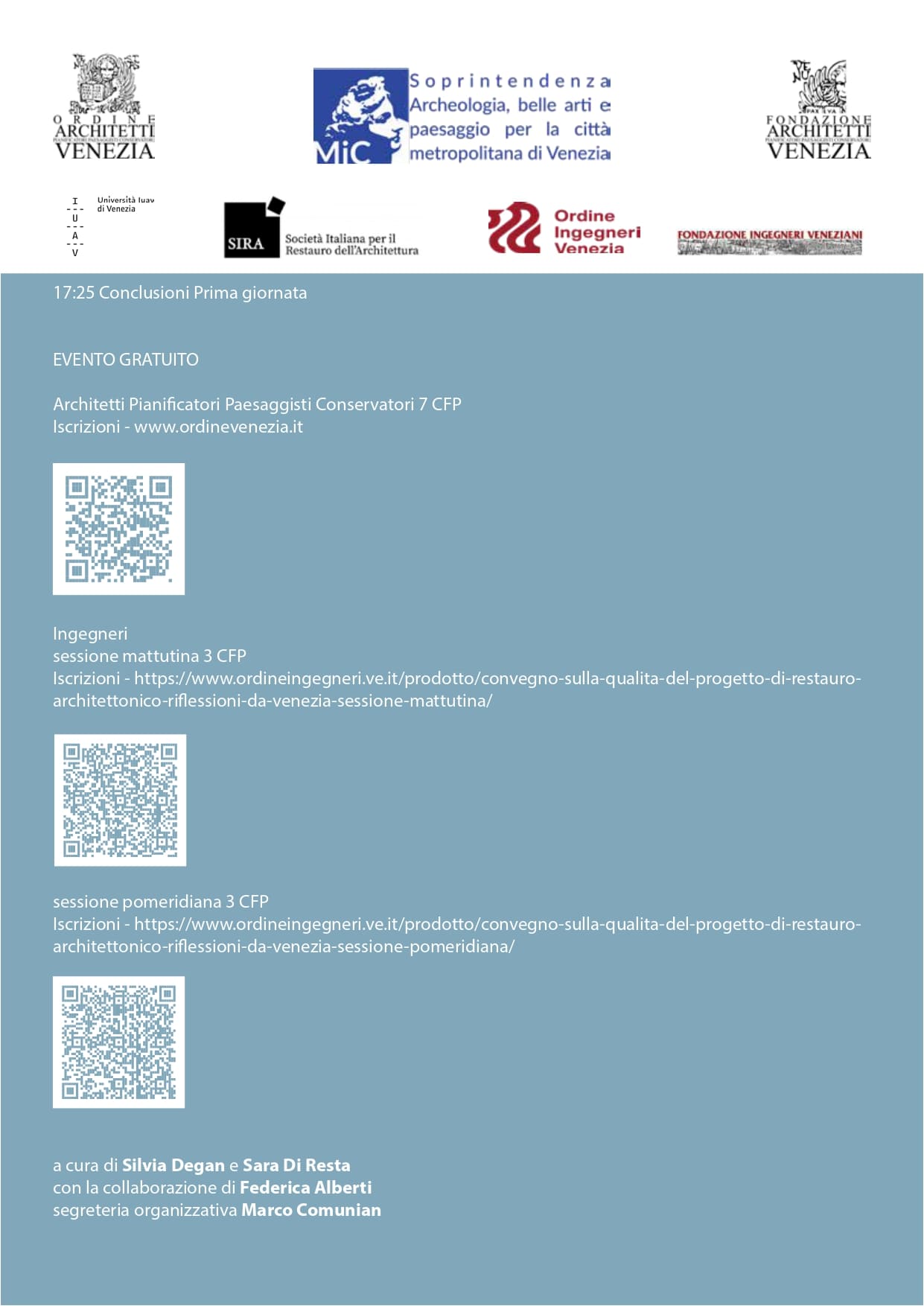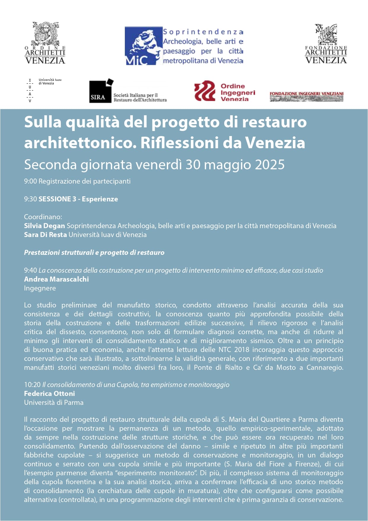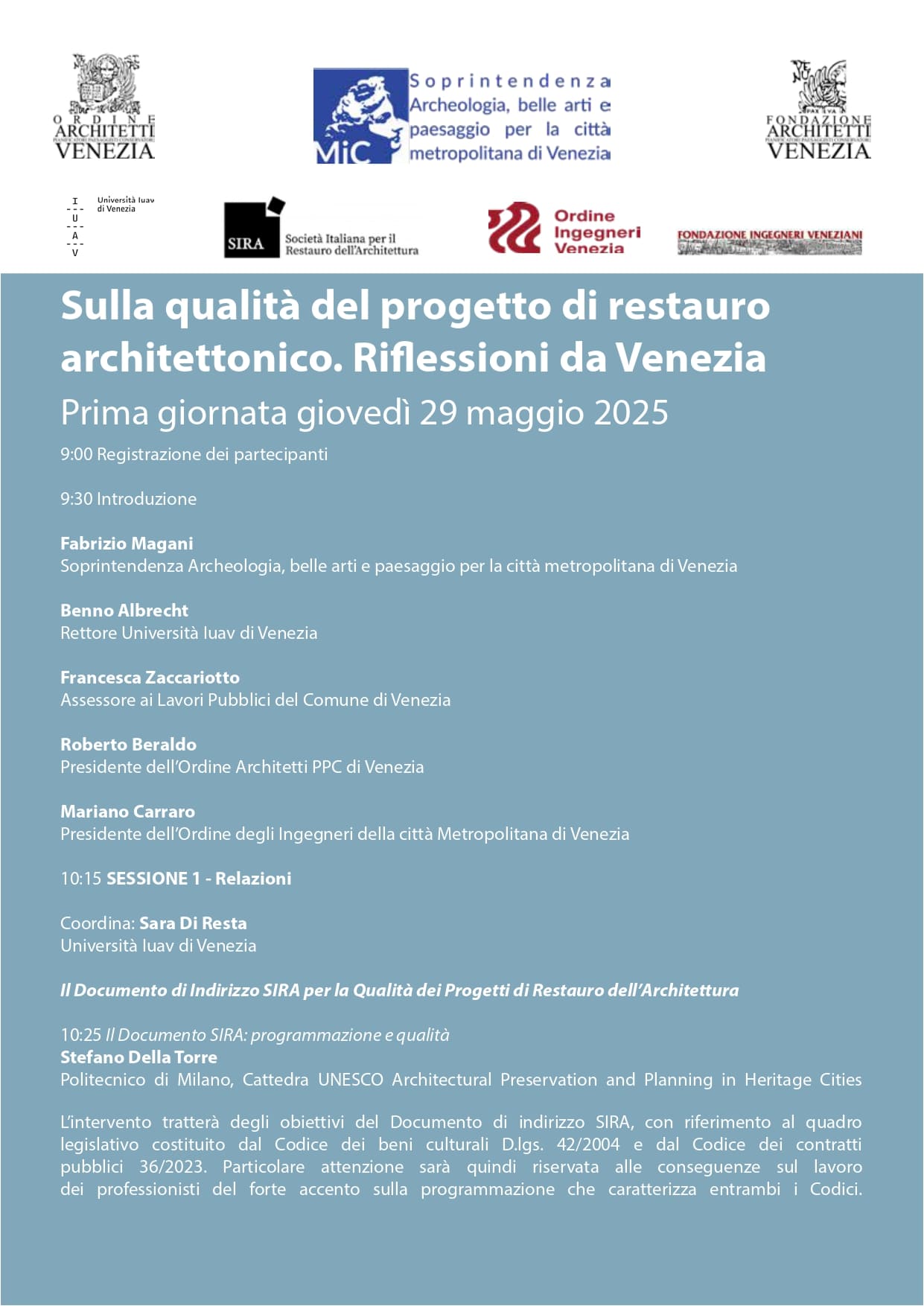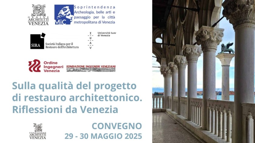 L’Ordine Ingegneri Venezia con l’Ordine Architetti Pianificatori Paesaggisti e Conservatori Venezia, la Soprintendenza Archeologia, belle arti e paesaggio per il Comune di Venezia e Laguna, la Società Italiana per il restauro dell’Architettura, l’Università Iuav di Venezia, la Fondazione Ingegneri Veneziani e la Fondazione Architetti, Pianificatori, Paesaggisti, Conservatori della provincia di Venezia organizzano il convegno gratuito sul tema “Sulla qualità del progetto di restauro architettonico. Riflessioni da Venezia” che si terrà a Venezia il 29 e 30 maggio 2025 presso Palazzo Ducale, Salone del Piovego con il seguente programma: