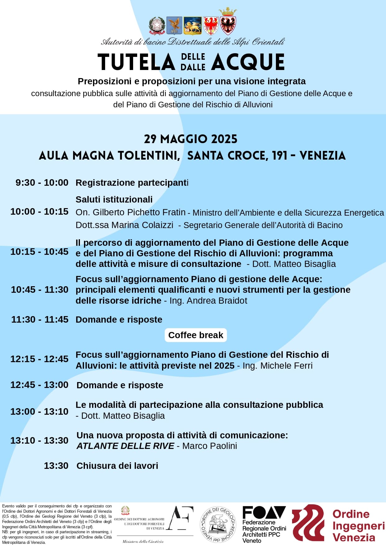 Dopo i saluti istituzionali del Ministro dell’Ambiente e della Sicurezza Energetica on. Gilberto Pichetto Fratin e del Segretario Generale dell’Autorità dott.ssa Marina Colaizzi, sono intervenuti il dott. Matteo Bisaglia, l’ing. Andrea Braidot e l’ing. Michele Ferri. Ha chiuso i lavori Marco Paolini con l’Atlante delle Rive.