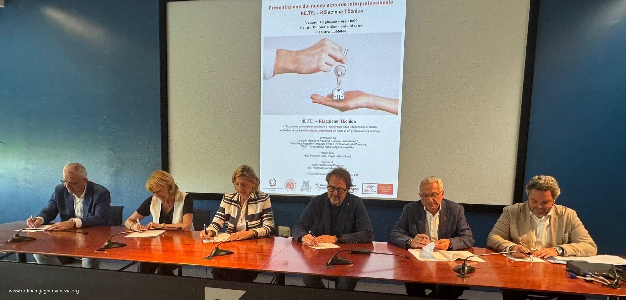 L’Ordine Ingegneri Venezia ha sottoscritto l’accordo congiuntamente con: Consiglio Notarile; Collegio dei Geometri e Geometri Laureati; Ordine degli Architetti, Pianificatori, Paesaggisti e Conservatori; Ordine dei Periti Industriali di Venezia; FIAIP.