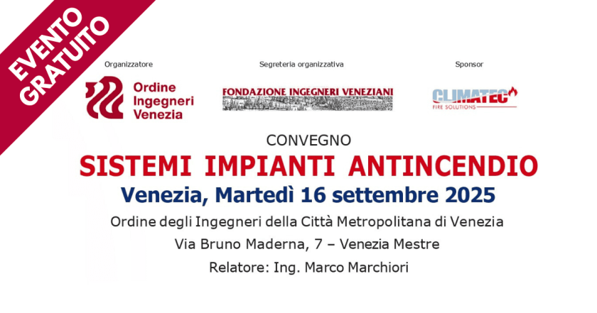 L’Ordine Ingegneri Venezia e la Fondazione Ingegneri Veneziani con Climatec Unipersonale S.r.l., organizzano il Convegno “Sistemi impianti antincendio”.