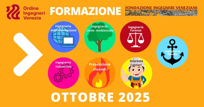 Eventi formativi OTTOBRE 2025 per l’aggiornamento professionale organizzati dall’Ordine Ingegneri Venezia in collaborazione con la Fondazione Ingegneri Veneziani.