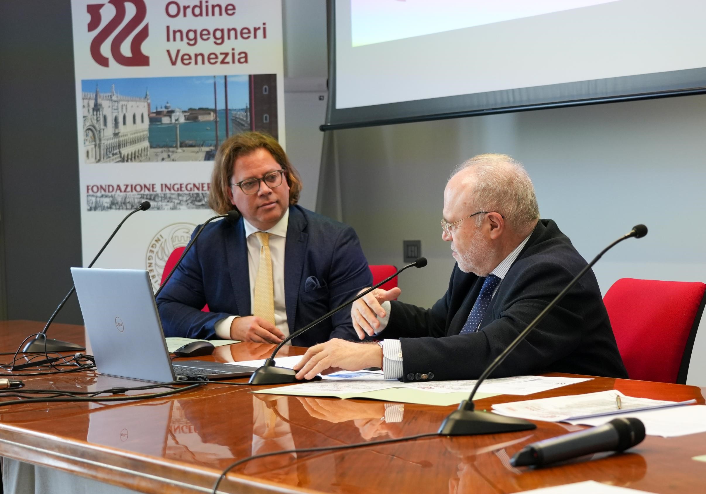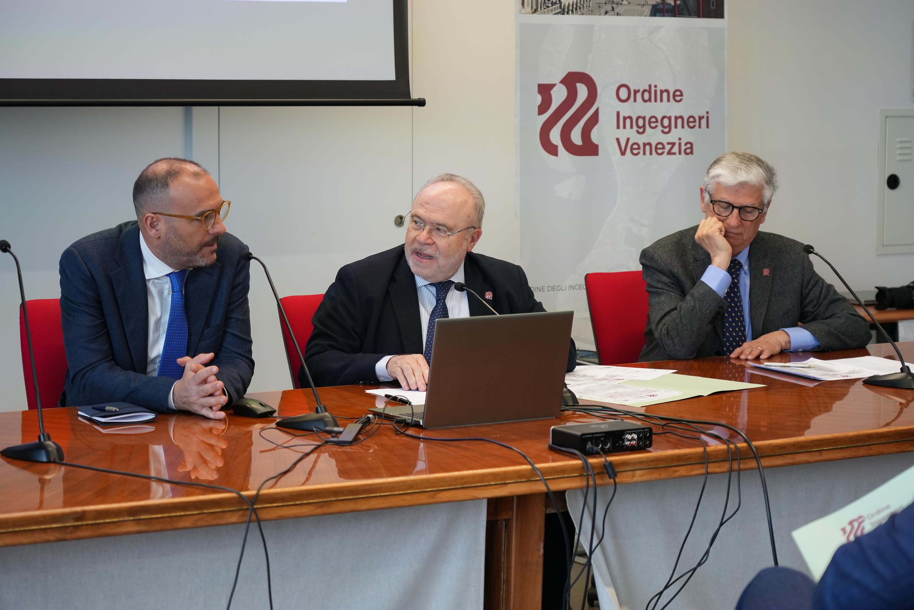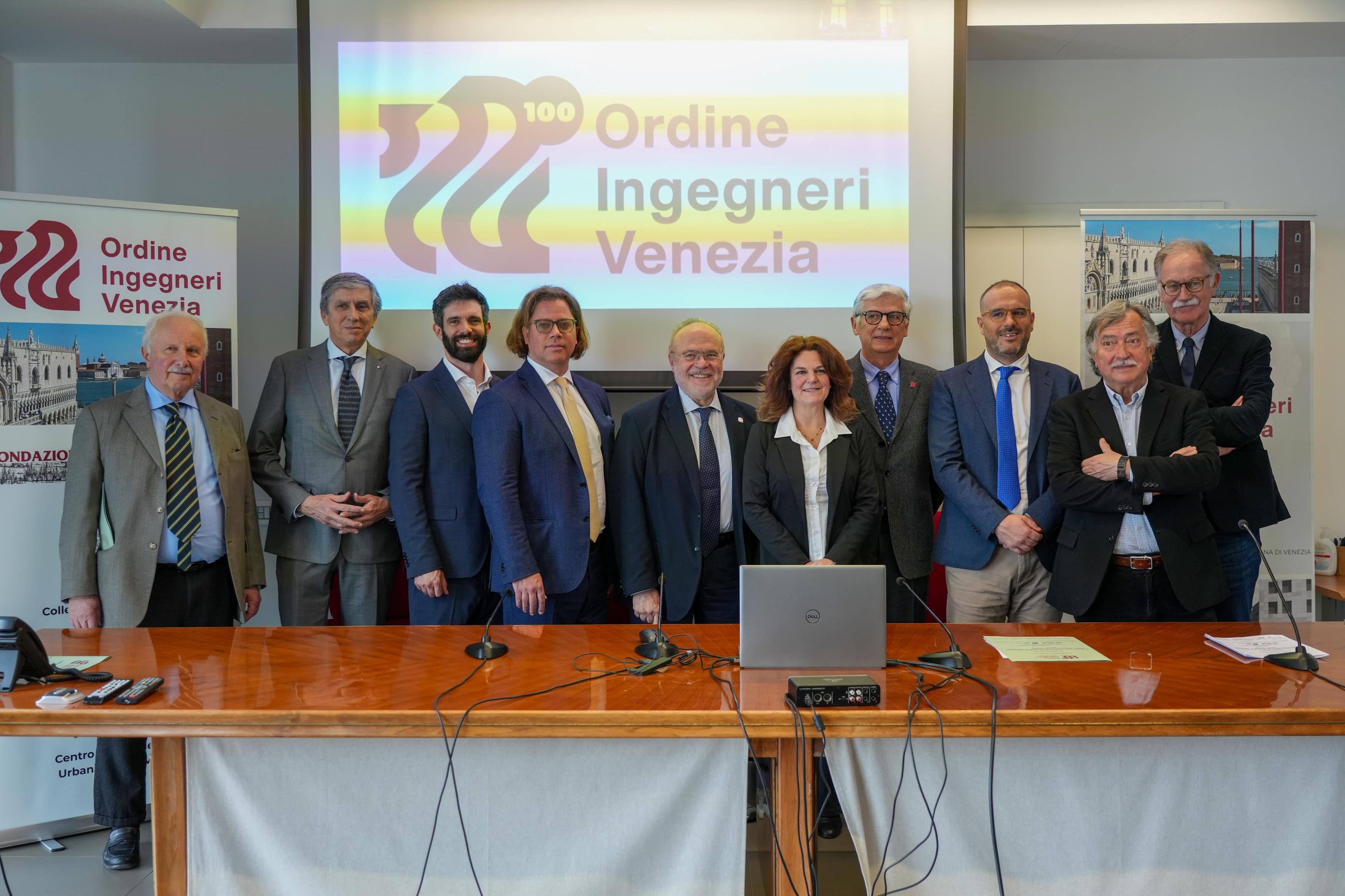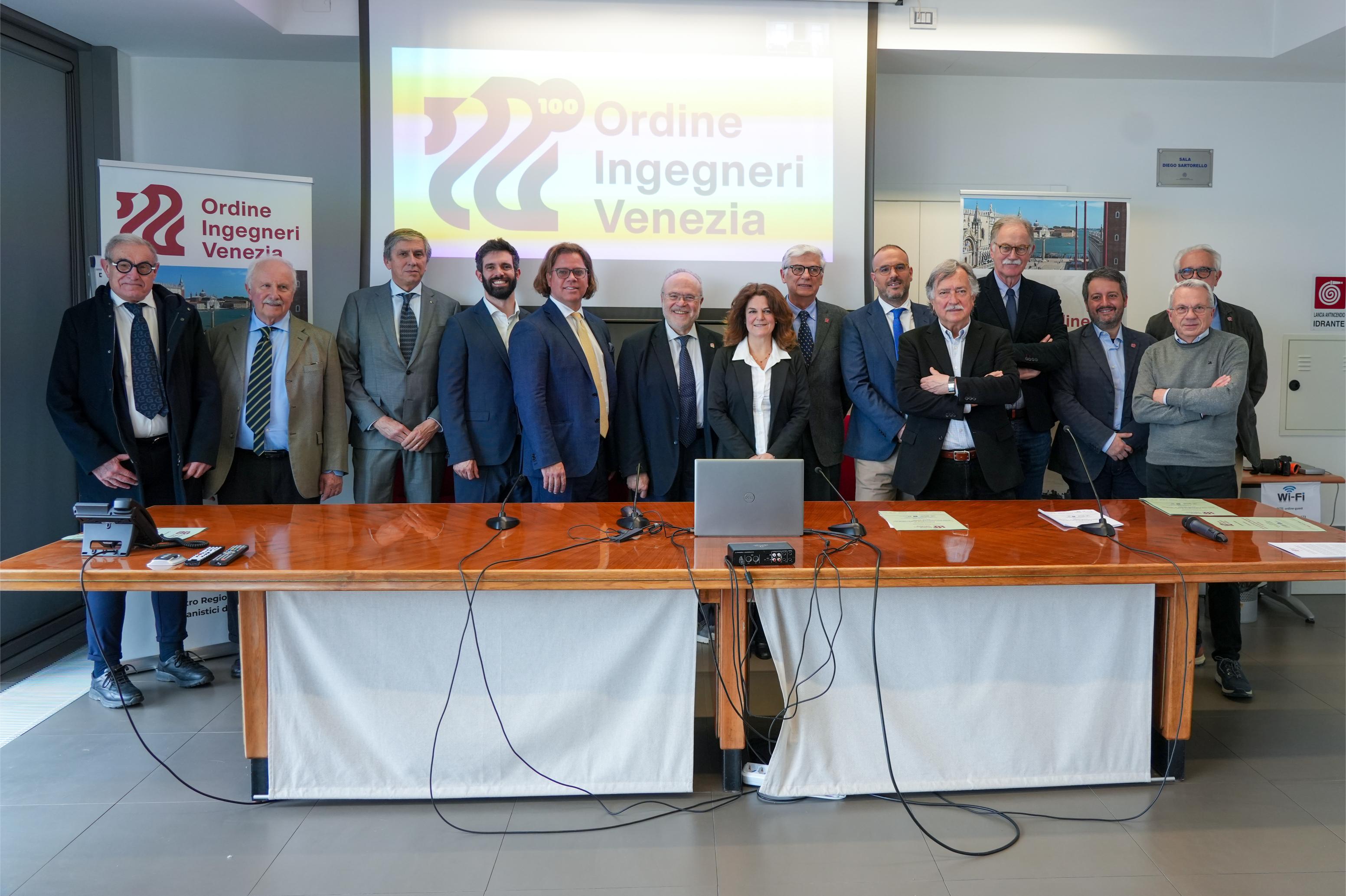 Alla conferenza stampa, tenutasinella sede dell’Ordine a Mestre, sono intervenuti: Mariano Carraro, Presidente dell’Ordine Ingegneri Venezia; Maurizio Pozzato, Coordinatore del Gruppo di Lavoro del Centenario e Presidente del Comitato Scientifico; Donatella Calabi, curatrice del volume del Centenario, insieme alle Autorità e ai Main Partner dell’iniziativa.