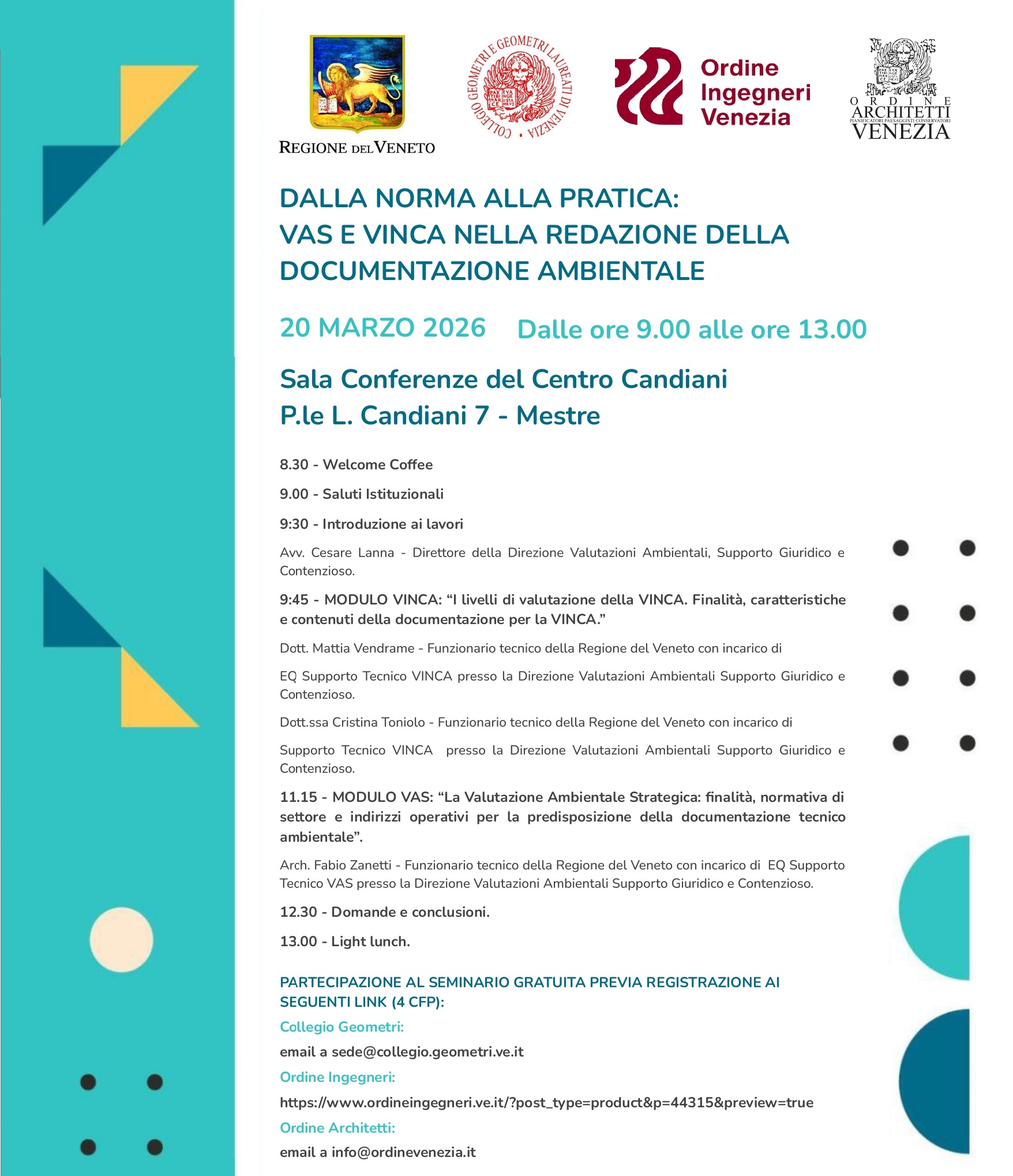 La nostra adesione all’invito della Regione del Veneto, condivisa con l’Ordine degli Architetti e con il Collegio dei Geometri, nasce dalla consapevolezza che l’efficacia delle valutazioni ambientali dipende in larga misura dalla qualità tecnica della documentazione prodotta dai professionisti. La recente evoluzione del quadro normativo regionale e l’aggiornamento degli indirizzi operativi richiedono un allineamento puntuale delle competenze, affinché la VAS, la VIA e la VINCA possano svolgere pienamente la loro funzione di strumenti preventivi, integrati e proporzionati.