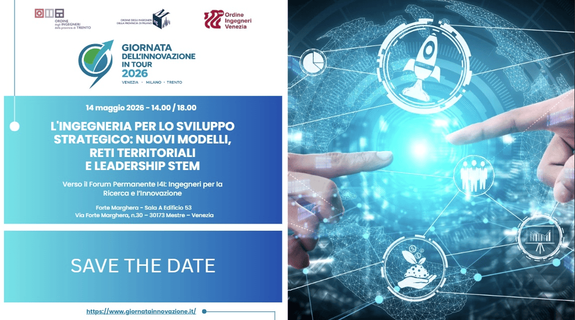 La prima tappa del Tour 2026 è in programma per il 14 maggio 2026 ed è intitolata L’Ingegneria per lo Sviluppo Strategico: Nuovi Modelli, Reti Territoriali e Leadership STEM – Verso il Forum Permanente I4I: Ingegneri per la Ricerca e l’Innovazione. Il convegno è co-organizzato dagli ordini degli Ingegneri di Venezia, Trento e Milano si terrà presso Forte Marghera a Mestre ma sarà trasmesso in streaming in tutta Italia e si propone di analizzare come le competenze tecniche, unite ad una visione sistemica, siano determinanti per la crescita industriale, la valorizzazione del territorio e l’affermazione sui mercati internazionali del nostro sistema economico industriale.